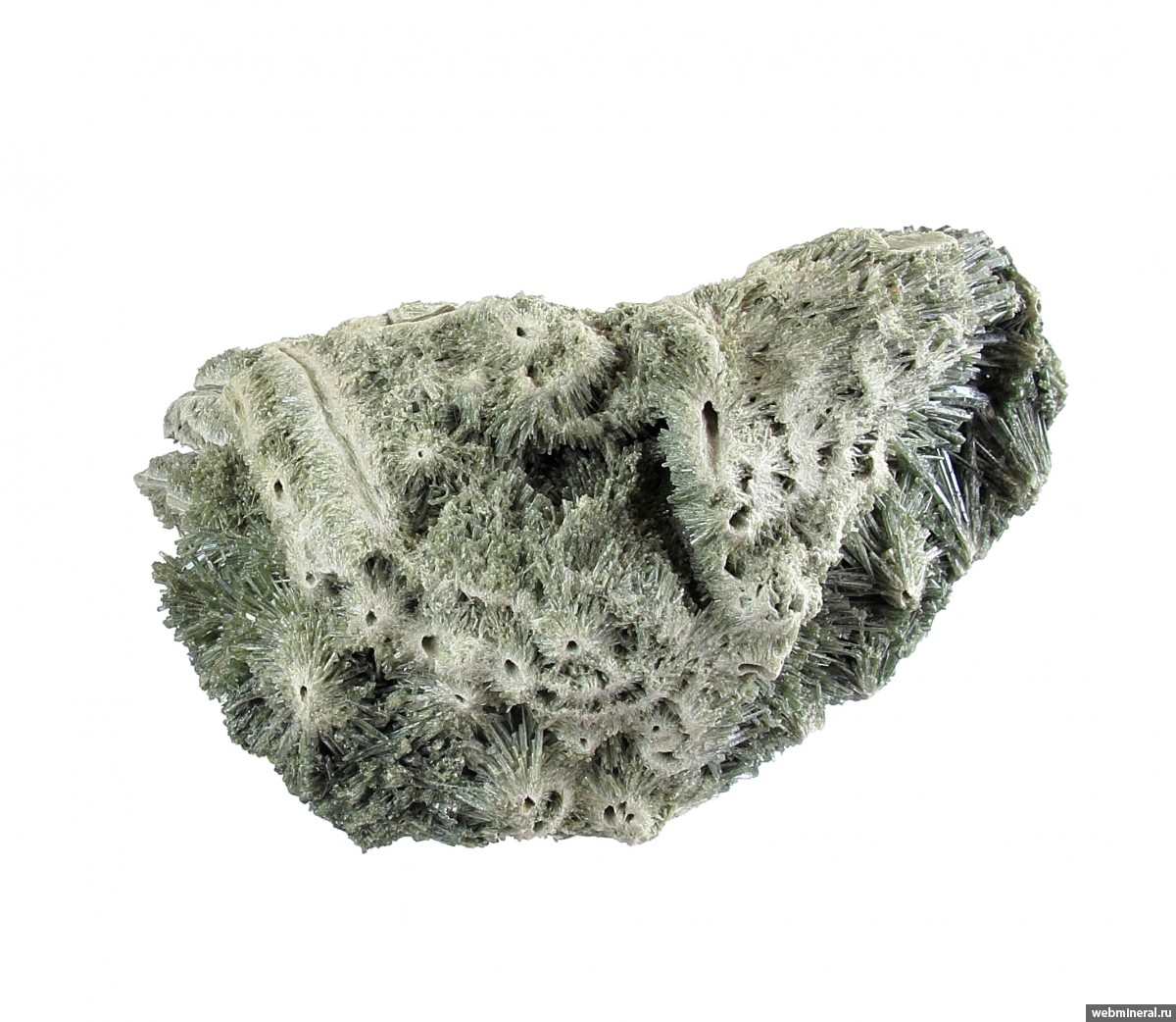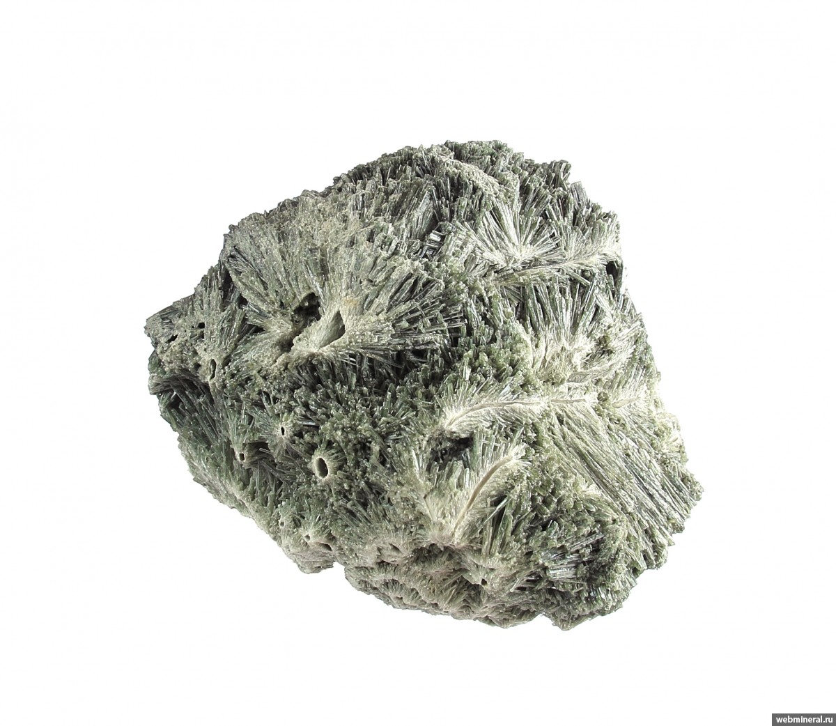 Сросшиеся в объёмную друзовую корку мономинеральные агрегаты диопсида в виде полых трубок, обросших щётками тонких немного уплощённых длиннопризматических кристаллов. Стенки трубок сложены белёсыми волокнистыми кристаллами. От стенок идёт расщеплённый рост, на удалении от каналов размер кристаллов увеличивается, и формируются друзовые агрегаты полупрозрачных кристаллов. Цвет серовато-зелёный. Сборы 2025 г.