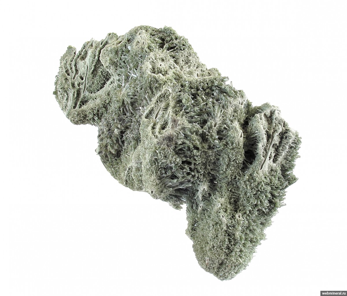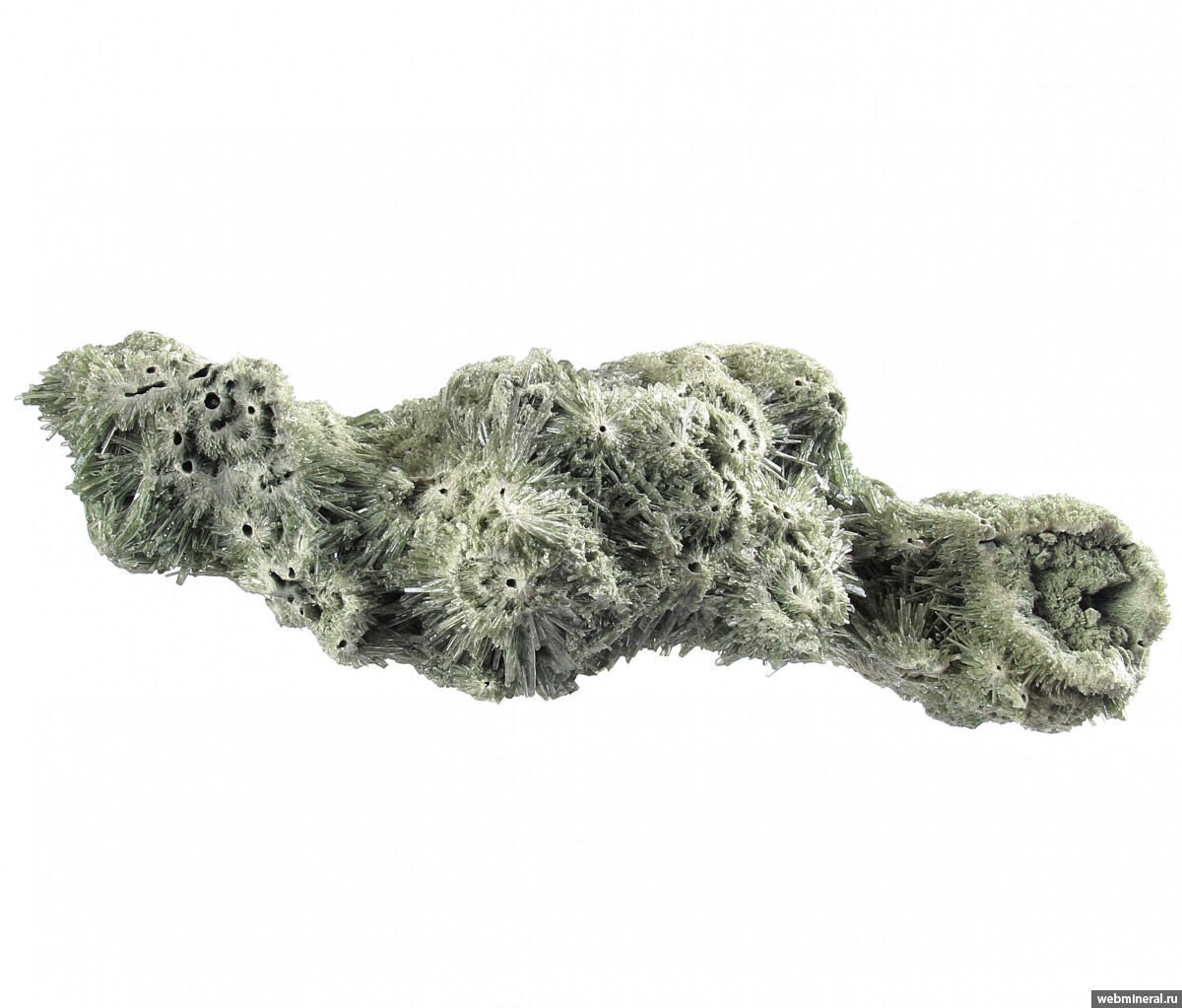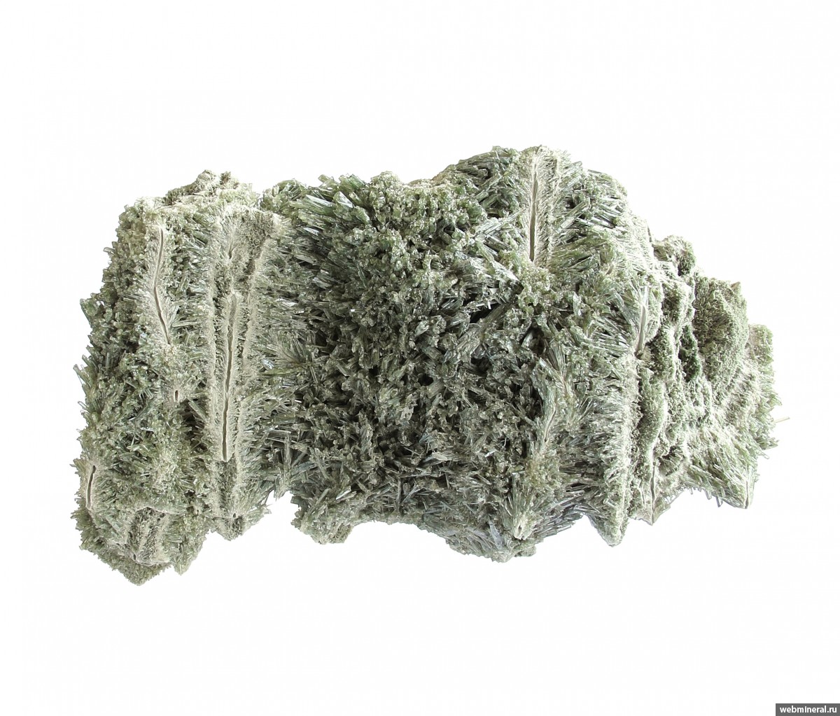 Сросшиеся в объёмную друзовую корку мономинеральные агрегаты диопсида в виде полых трубок, обросших щётками тонких немного уплощённых длиннопризматических кристаллов. Стенки трубок сложены белёсыми волокнистыми кристаллами. От стенок идёт расщеплённый рост, на удалении от каналов размер кристаллов увеличивается, и формируются друзовые агрегаты полупрозрачных кристаллов. Цвет серовато-зелёный. Сборы 2025 г.