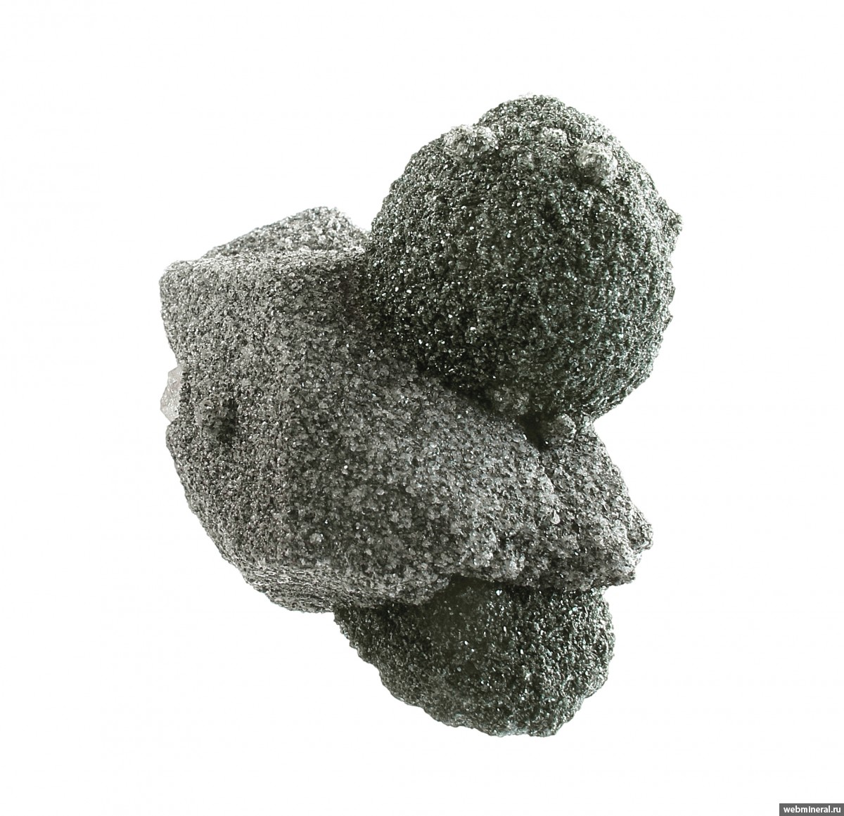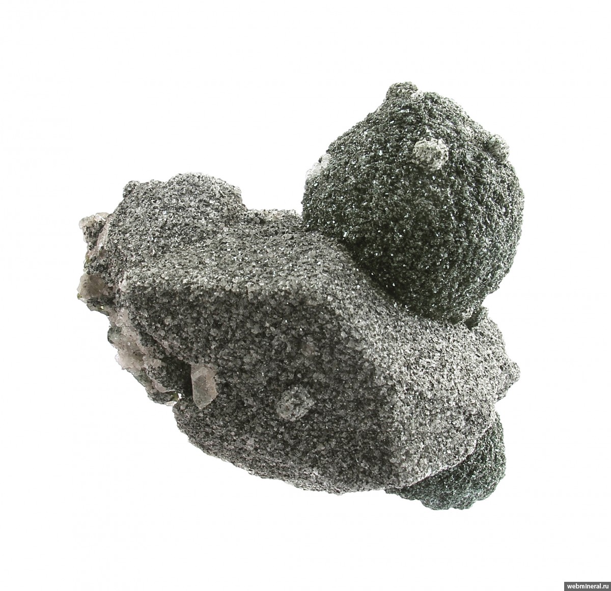 Тёмно-зелёные cферолиты хлорита (4 и 3 см в диаметре) на кристалле альбита (7 см), покрытом зернистой корочкой хлорита с альбитом. Мелкие белёсые округлые скопления (до 5мм) также сложены зёрнами альбита с хлоритом. Сферолит хлорита на обратной стороне образца сколот, на сколе видно, что он сложен хаотично ориентированными кристаллами.