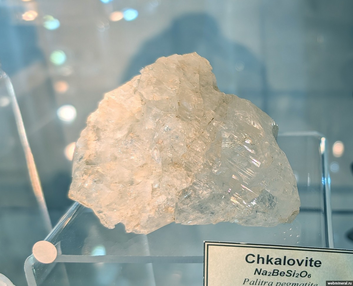 Полуограненный кристалл бесцветного чкаловита изначально окруженный скоплениями натросилита, растворившего впоследствии протекающими по горной выработке подземными водами. Находка - 2025 год.