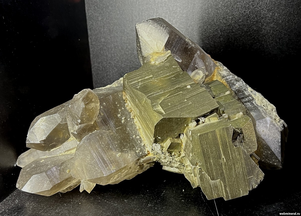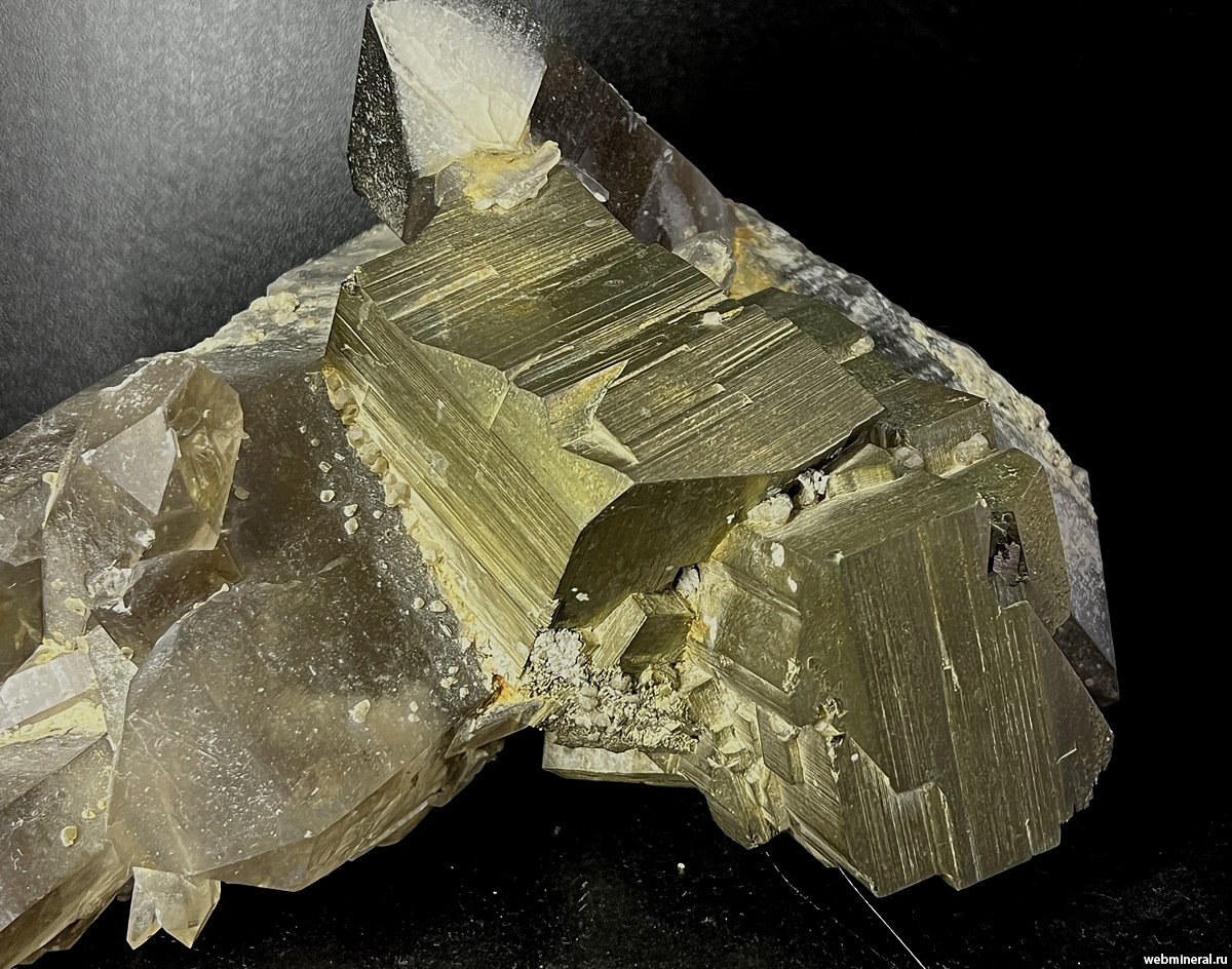 Крупные кристаллы пирита на друзе кварца. Образец из коллекции Пелепенко В.А.