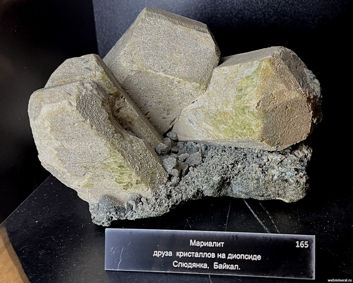 На этикетке указано что это мариалит. На самом деле результаты многочисленных анализов показвают, что скаполиты из флогопит-кальцит-диопсидовых жил Слюдянки относятся к кальциевым членам изоморфного ряда мариалит-мейонит. Т.е. этикетка ошибочна.