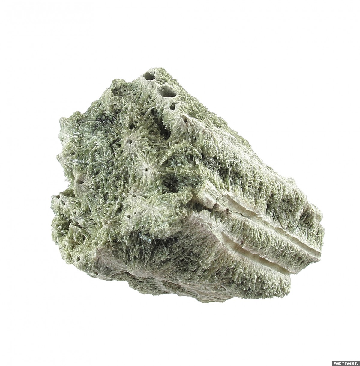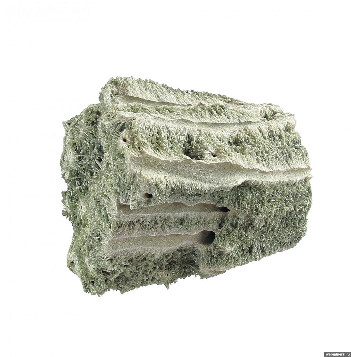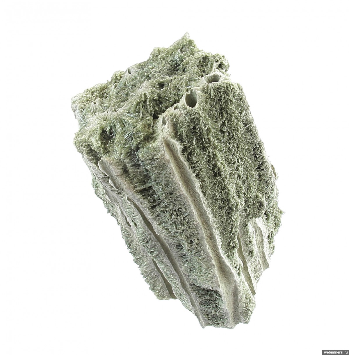 Тесно сросшиеся мономинеральные агрегаты диопсида в виде полых трубок, обросших щётками тонких немного уплощённых длиннопризматических кристаллов. Стенки трубок сложены белёсыми волокнистыми кристаллами. От стенок идёт расщеплённый рост, на удалении от каналов размер кристаллов увеличивается, и формируются друзовые агрегаты полупрозрачных кристаллов. Цвет - пыльный серовато-зелёный, светлый. Сборы 2025 г.