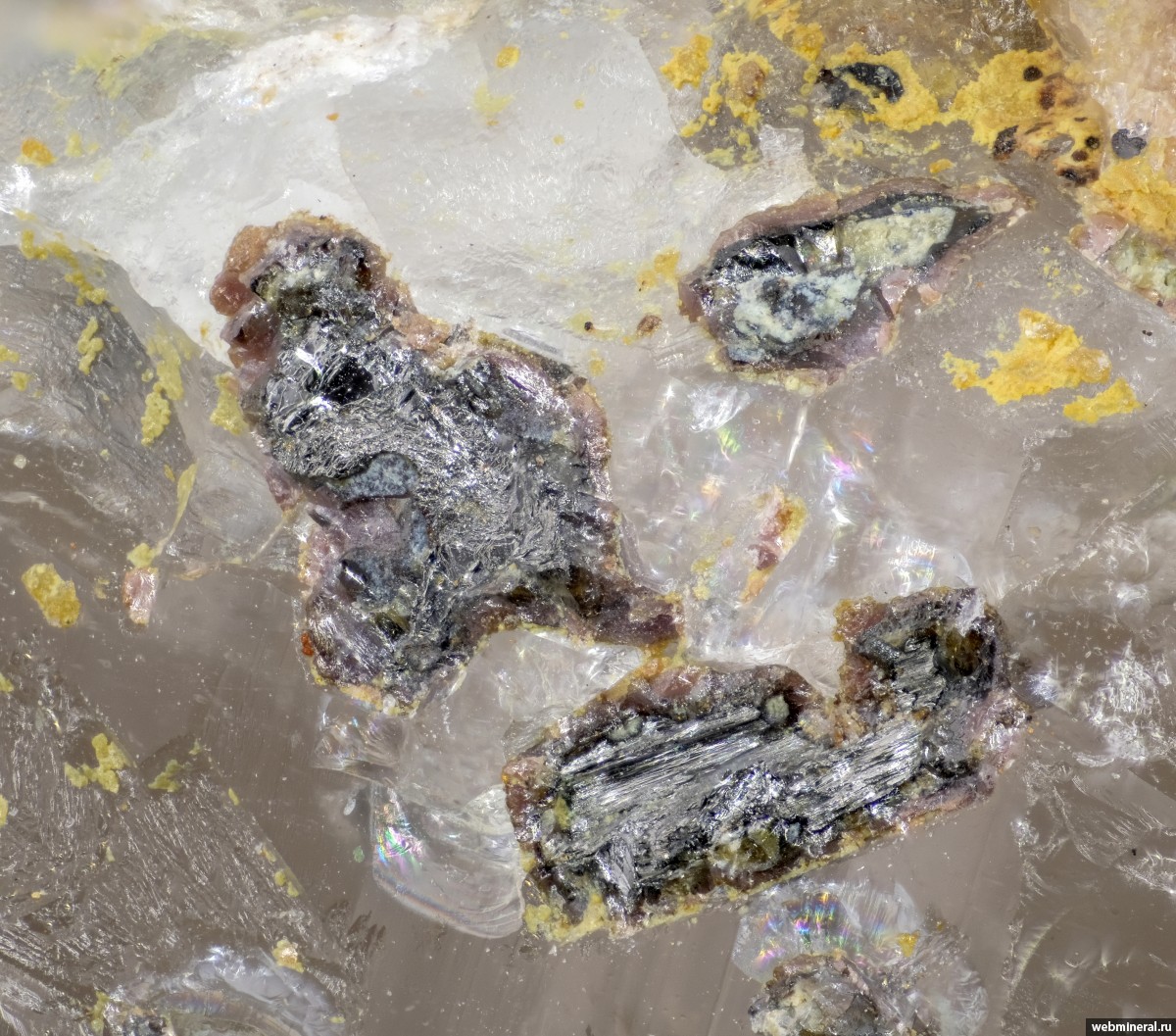 Стально-серые с красноватым отливом зёрна тетрадимита размером 1 мм в кварце. Часть зёрен тетрадимита замещается серо-зелёным монтанитом.