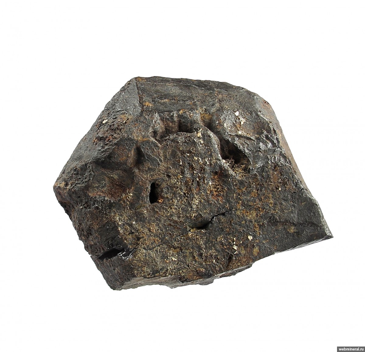Толстотаблитчатый кристалл ильменита с «мятой» гранью, трещинами и кавернами (?отпечатками). Поверхность граней в основном тусклая в охристых корочках продуктов изменения ильменита. Вероятно, кристалл рос в тектонически активной полости, и странные мятые складки на одной из граней - результат быстрой перекристаллизации на разрушенных участках грани. Образец из старых сборов, шахта была остановлена и затоплена в 1993г.