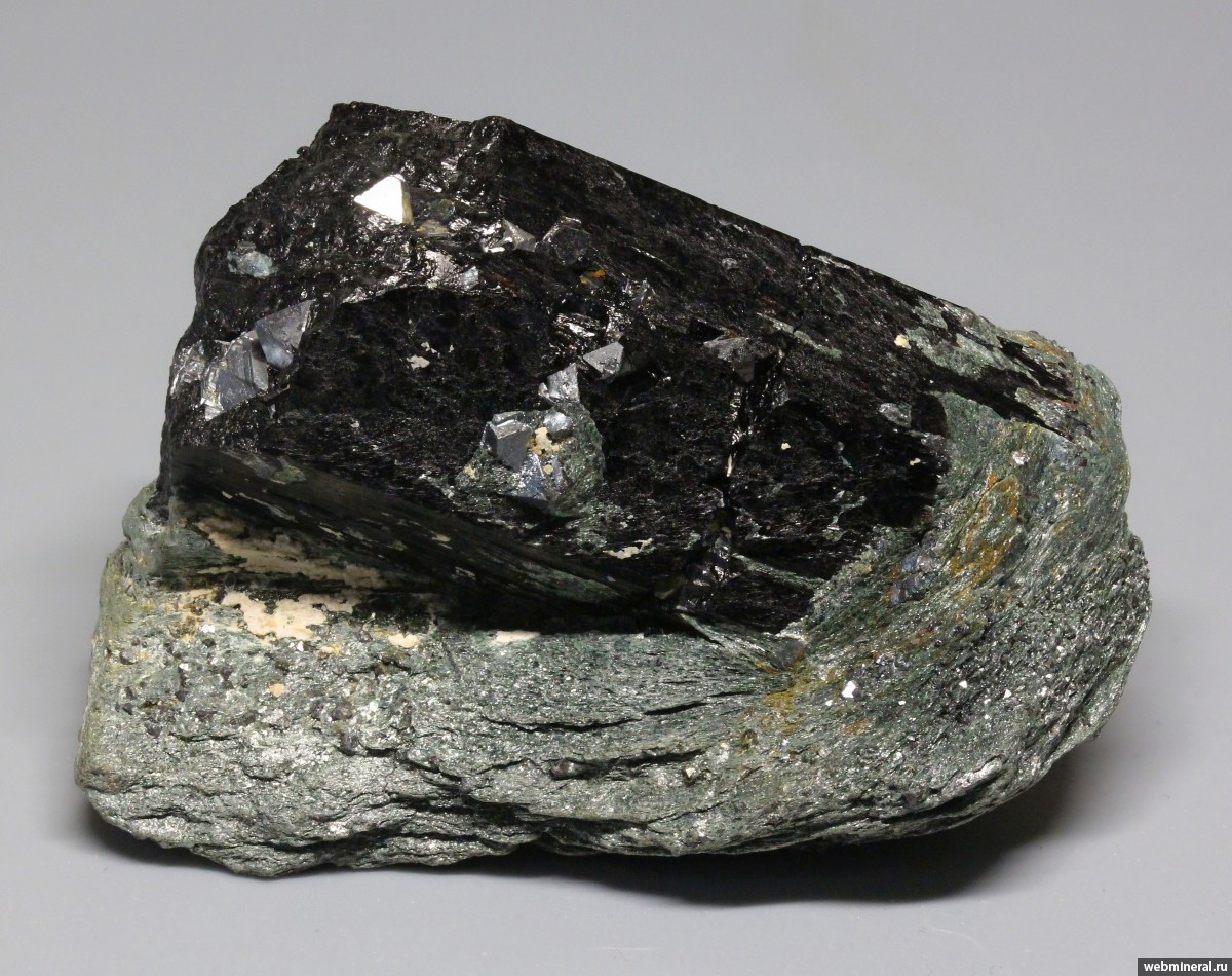 Призматический кристалл черного дравита в мелкочешуйчатом зеленоватом хлорите. Как дравит, так и хлорит содержат многочисленные включения мелких октаэдров блестящих магнетита.