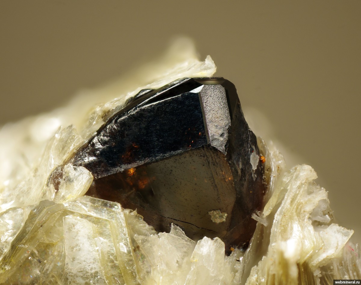 Кристалл темно-коричневого касситерита в мусковите.