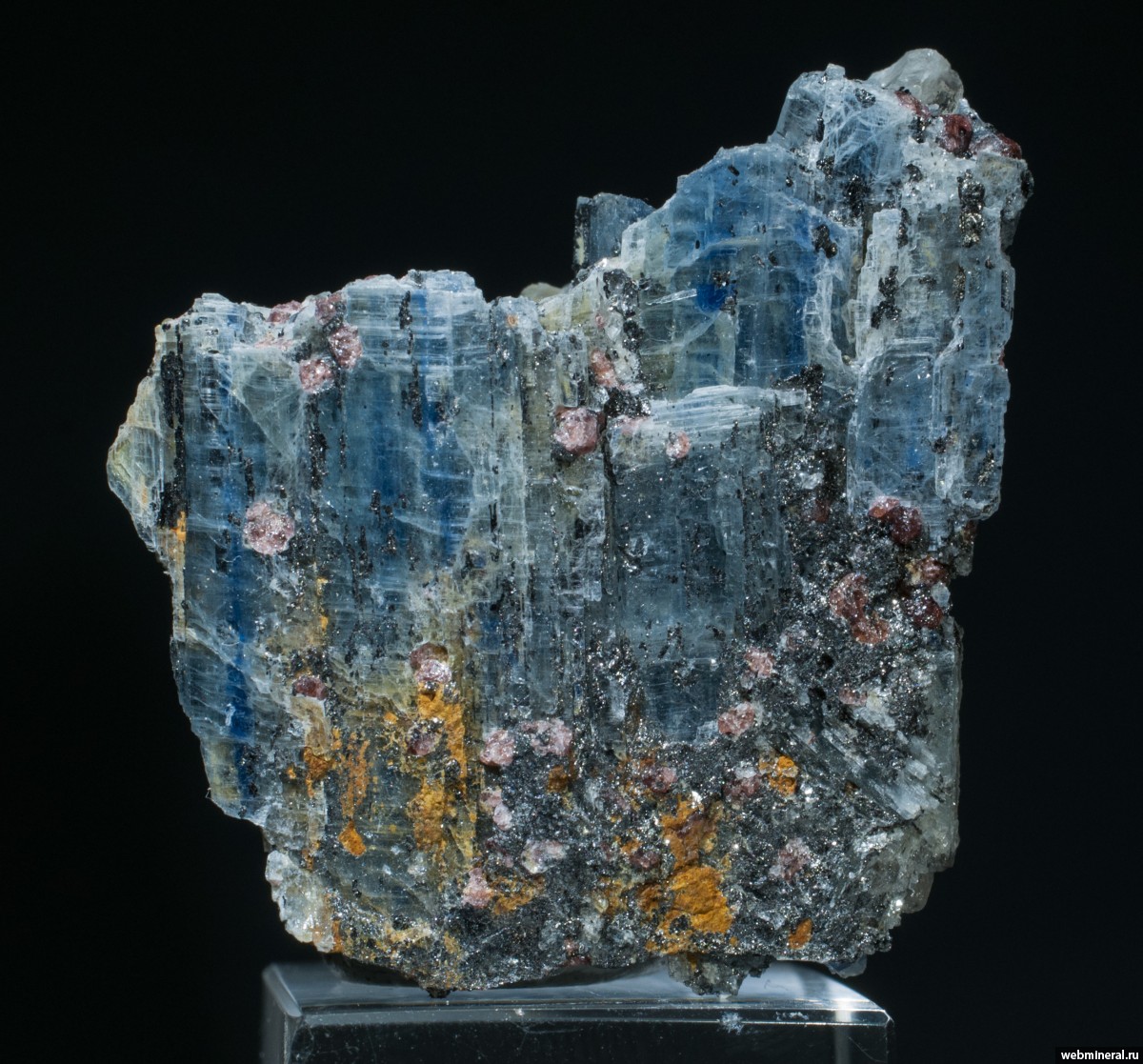 Фрагмент пластинчатого кристалла кианита с вростками черного графита и красного альмандина.