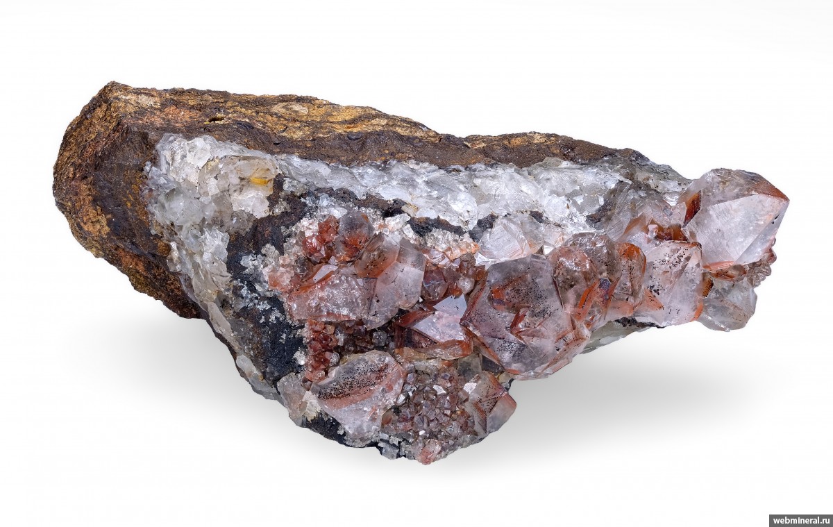 Кристаллы кварца, зонально окрашенного в красно-коричневый цвет включениями окислов/гидрокислов железа, на лимонитовой породе. Сборы - май 2025 года.