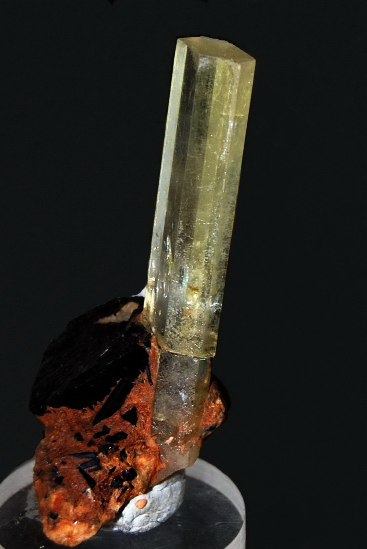 Кристалл гелиодора на породе сложенной желтоватом полевым шпатом и черным шерлом. Минералогический музей им. А.Е. Ферсмана РАН. Образец № 13893, Трест "Русские самоцветы", 1923 г. Фото - 2009 г.