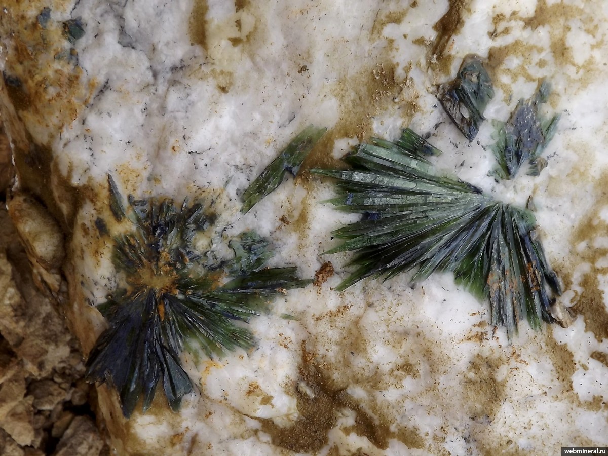 Радиально лучистые агрегаты вивианита на огромной глыбе кварца в забое карьера. Июль 2013 года.