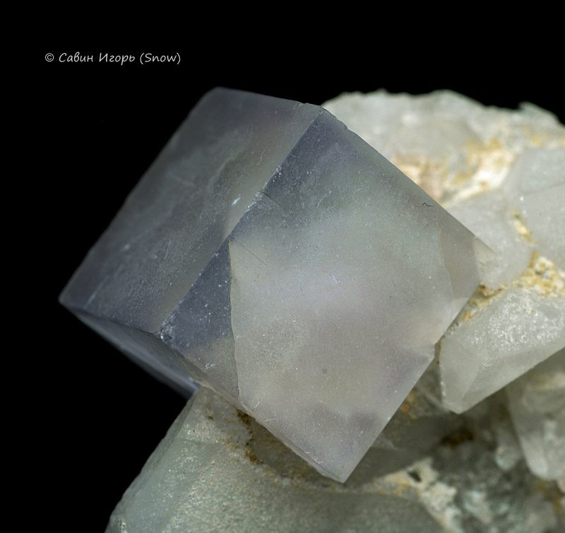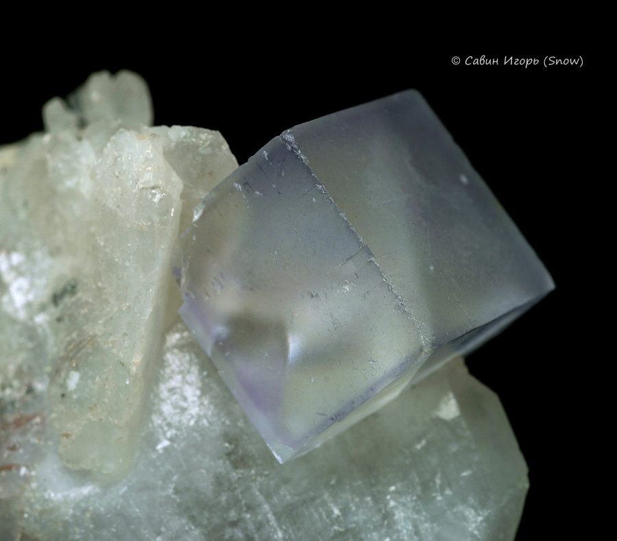 Кубический прозрачный кристалл флюорита размером 1,1 х 1,1 х 1,3 см на сростке двухголовых кристаллов белого кварца.