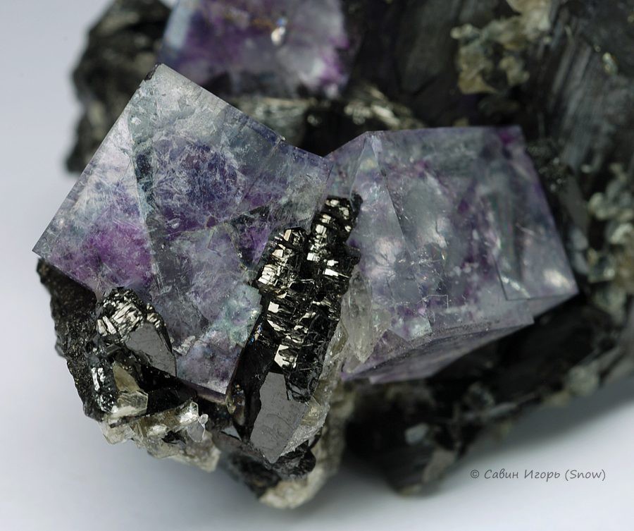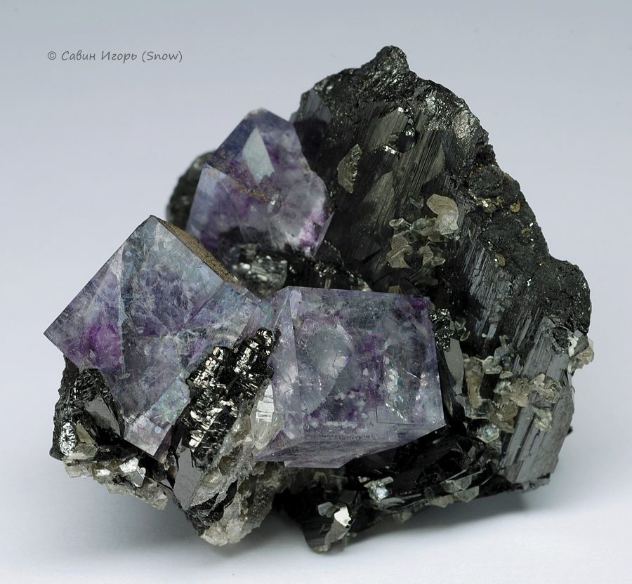 Сросток кристаллов фиолетового флюорита размером до 1,3 см с кристаллами вольфрамита и мусковитом.