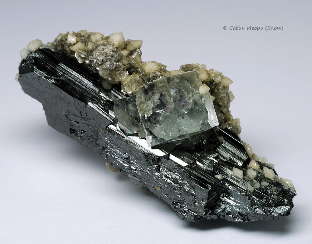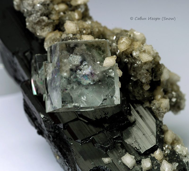 Сросток прозрачных кристаллов бесцветного флюорита (размер основного кристалла 1 см) на вольфрамите с кристаллами доломита и мусковитом.