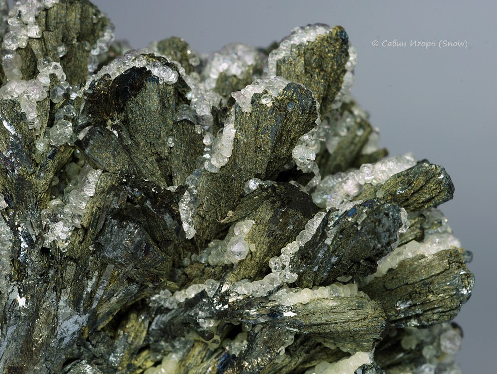Друза закрученных влево или вправо вдоль длинной оси кристаллов антимонита с нарастающими на них кристаллами фиолетового флюорита размером до 2 мм.