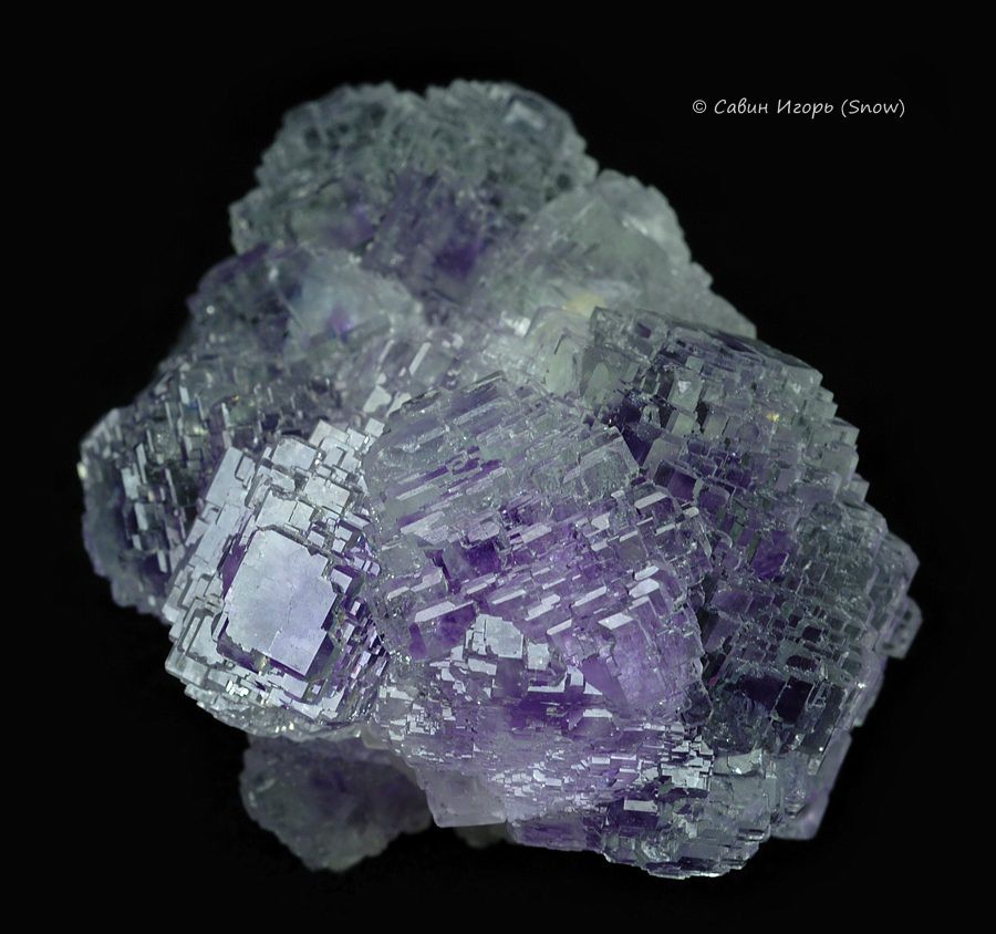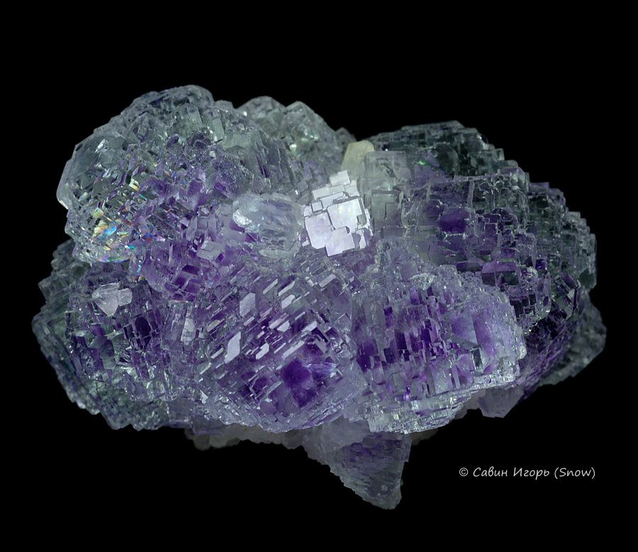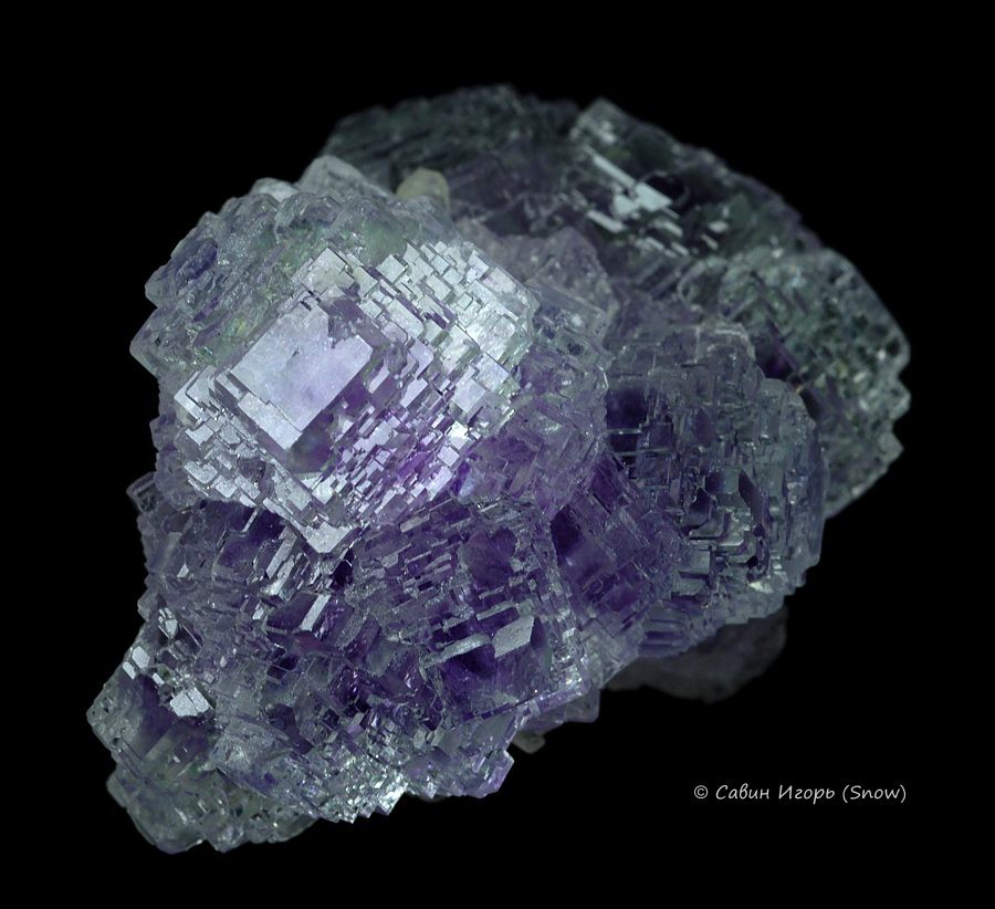 Сросток ступенчатых прозрачных двухцветных (светло-зеленый и фиолетовый) кристаллов флюорита.
