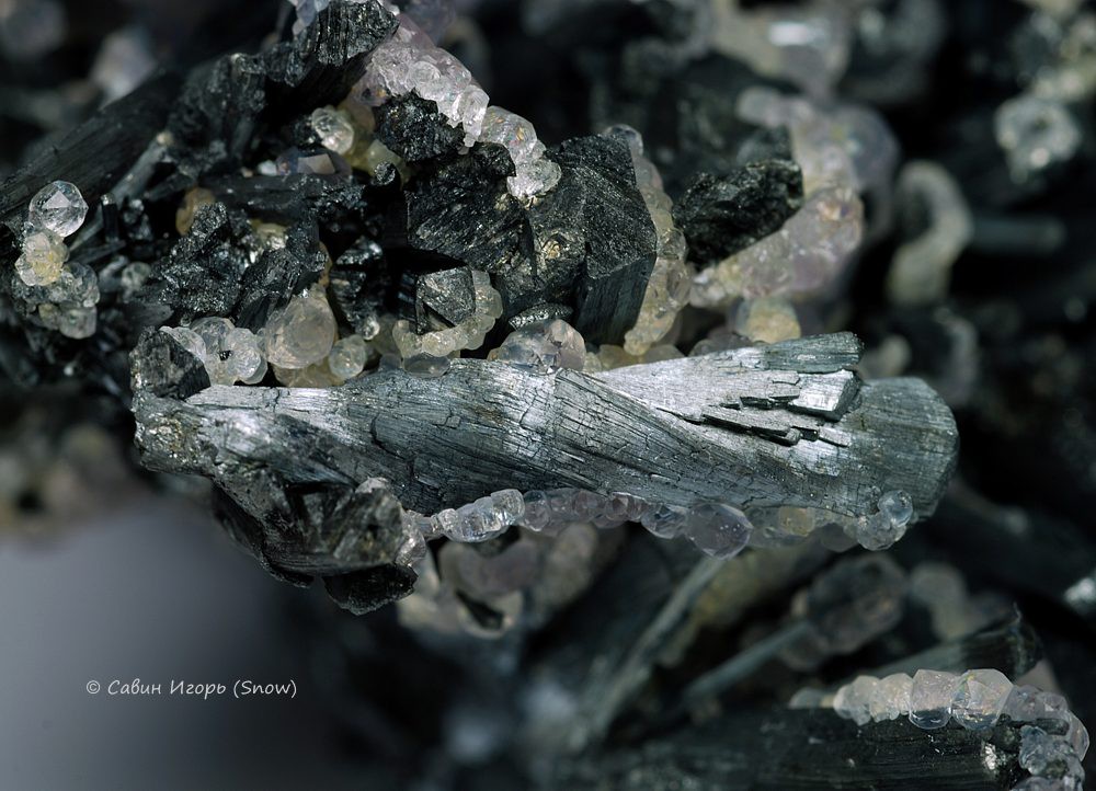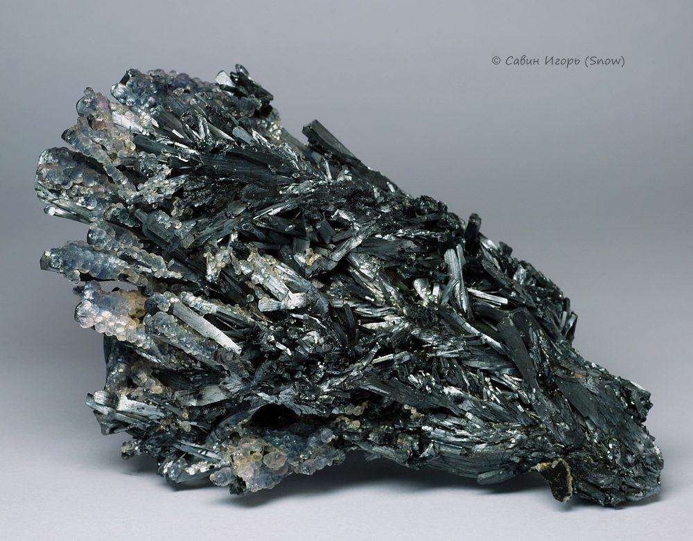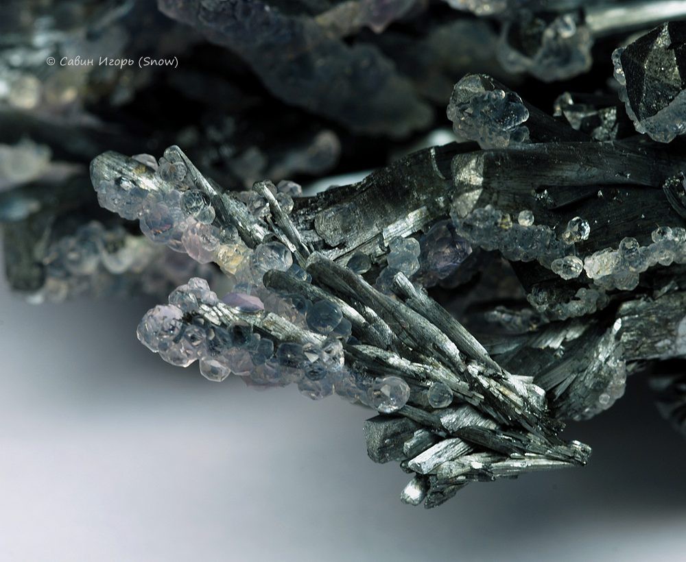 Сросток кристаллов антимонита с кристаллами флюорита размером до 2 мм. Часть кристаллов стибнита закручены влево или вправо вдоль длинной оси.
