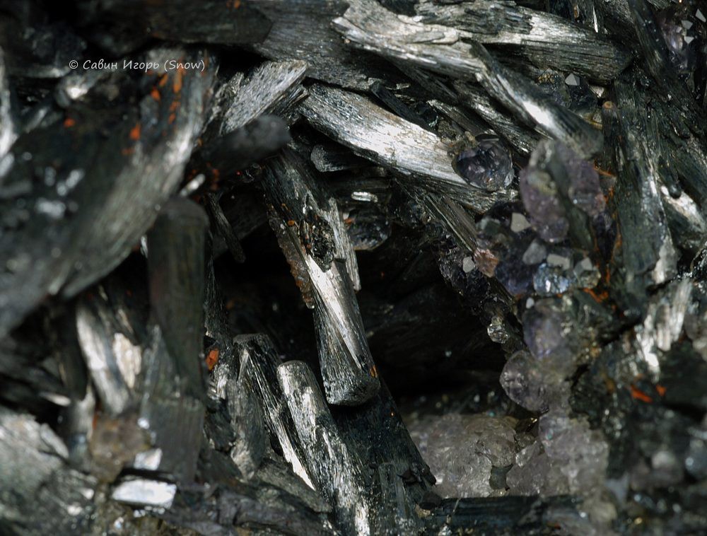 Сросток кристаллов антимонита с кристаллами флюорита размером до 2 мм. Часть кристаллов стибнита закручены влево или вправо вдоль длинной оси.