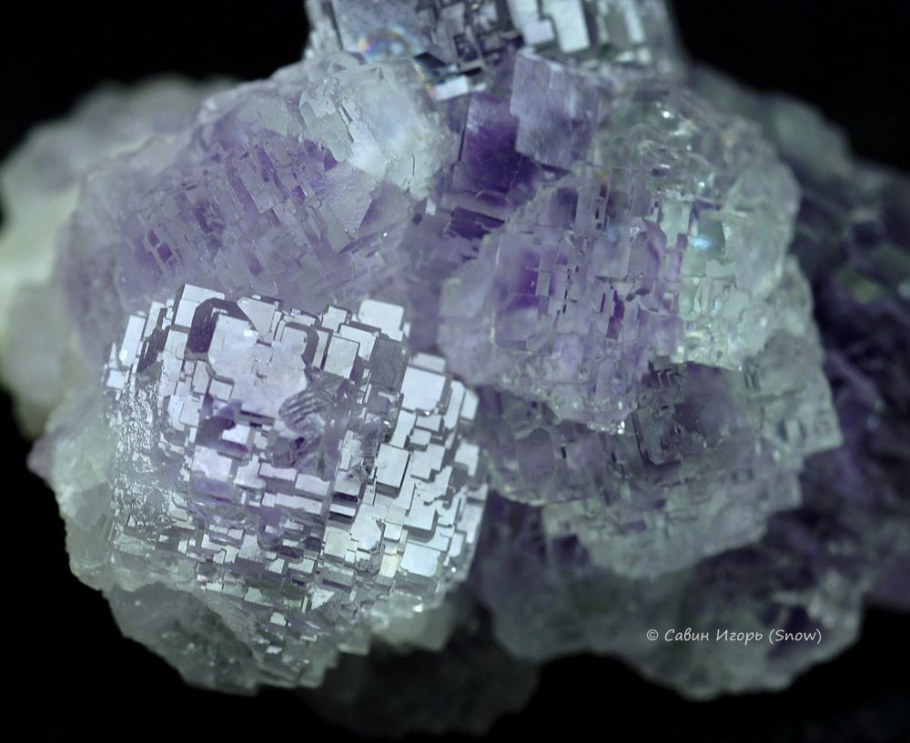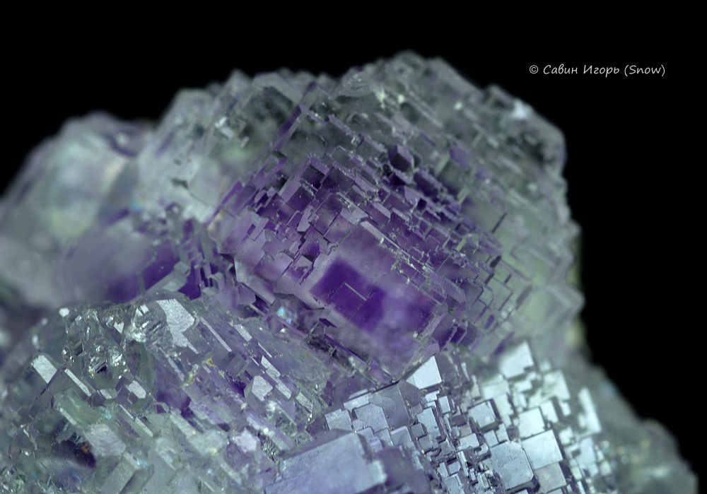 Сросток ступенчатых прозрачных двухцветных (светло-зеленый и фиолетовый цвета) кристаллов флюорита.