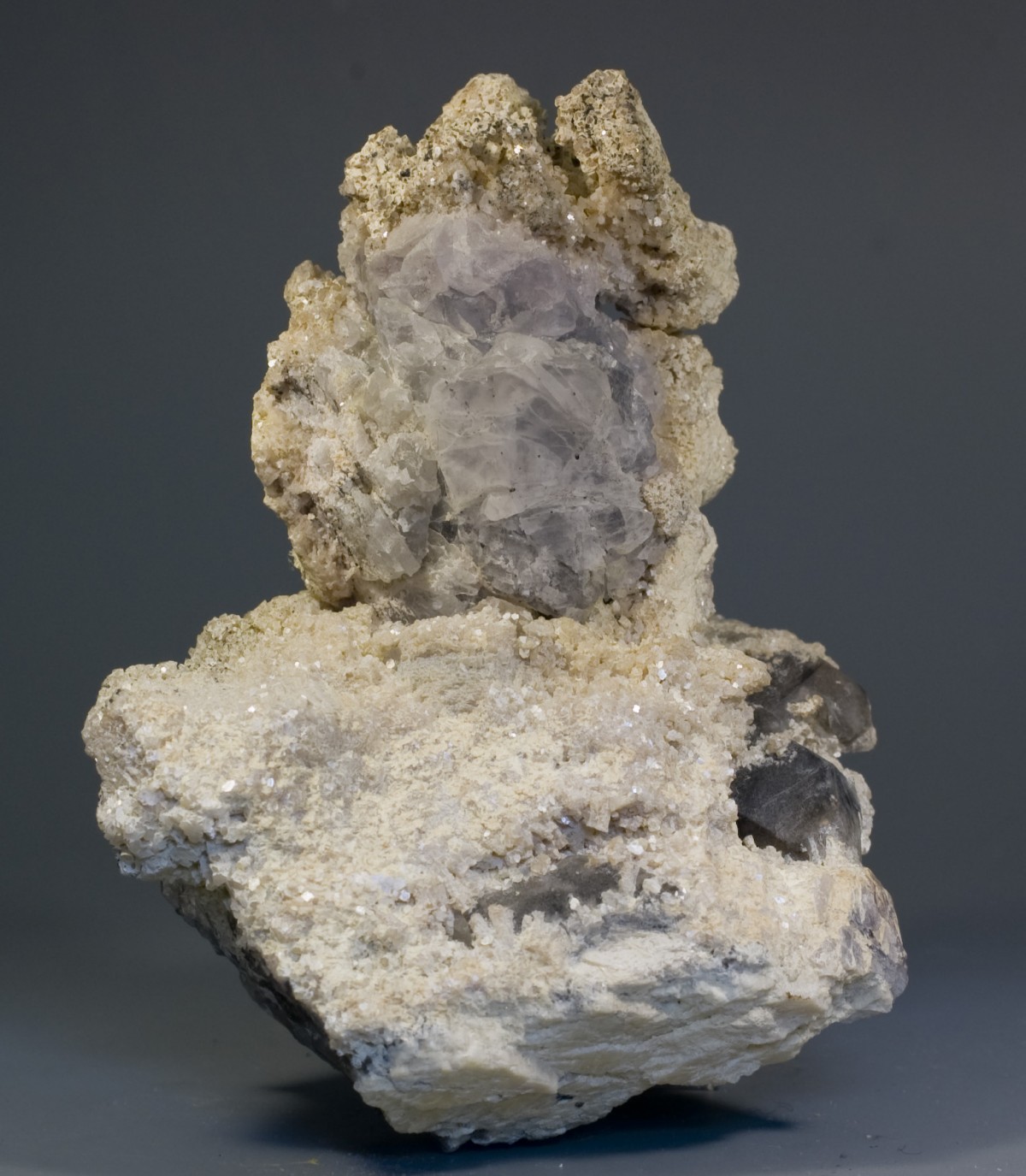 Крупный кристалл голубовато-серого топаза с присыпками мелкозернистого лепидолита из миаролы в пегматите. Коллекция Минералогического Музея им.А.Е.Ферсмана РАН, №94792, Задов А.Е., 2013г.