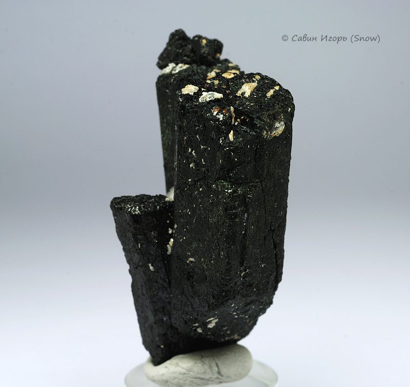 Сросток кристаллов эгирина длиной до 3,2 см с кристаллами пирохлора размером до 8 мм.