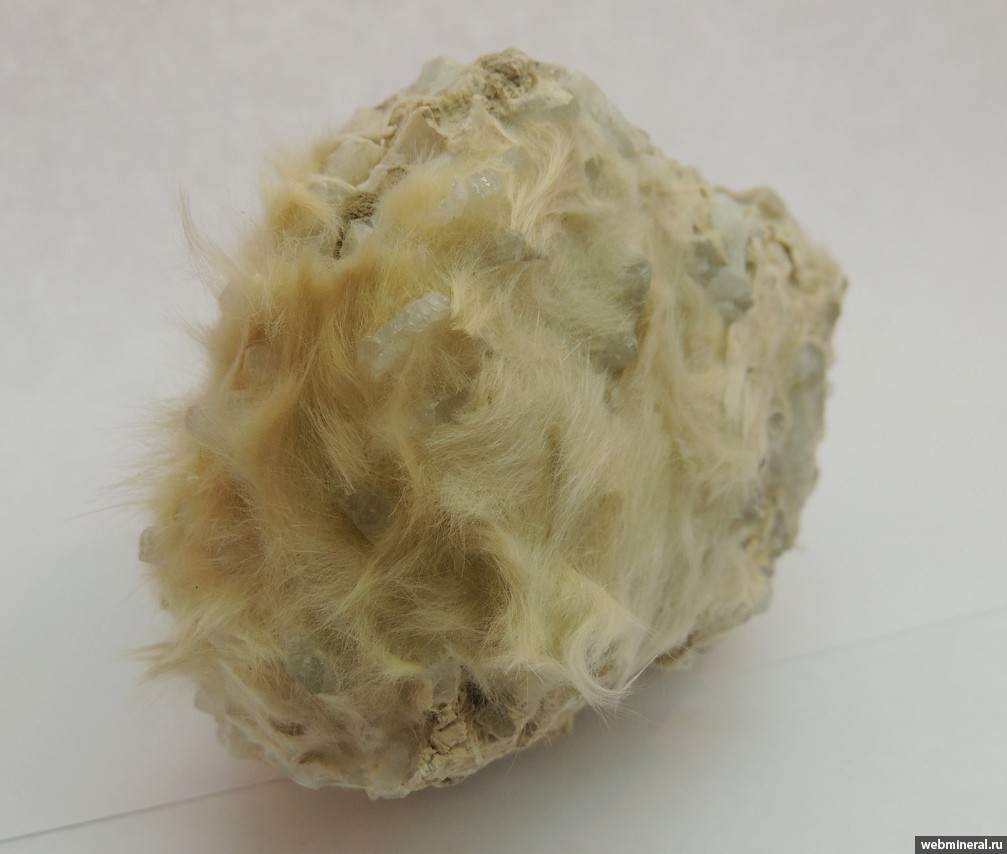 Агрегат светлого, тонковолокнистого тремолита наросший на щетку кристаллов альбита. Образец из коллекции музея "Штуфной Кабинет" (г. Североуральск)