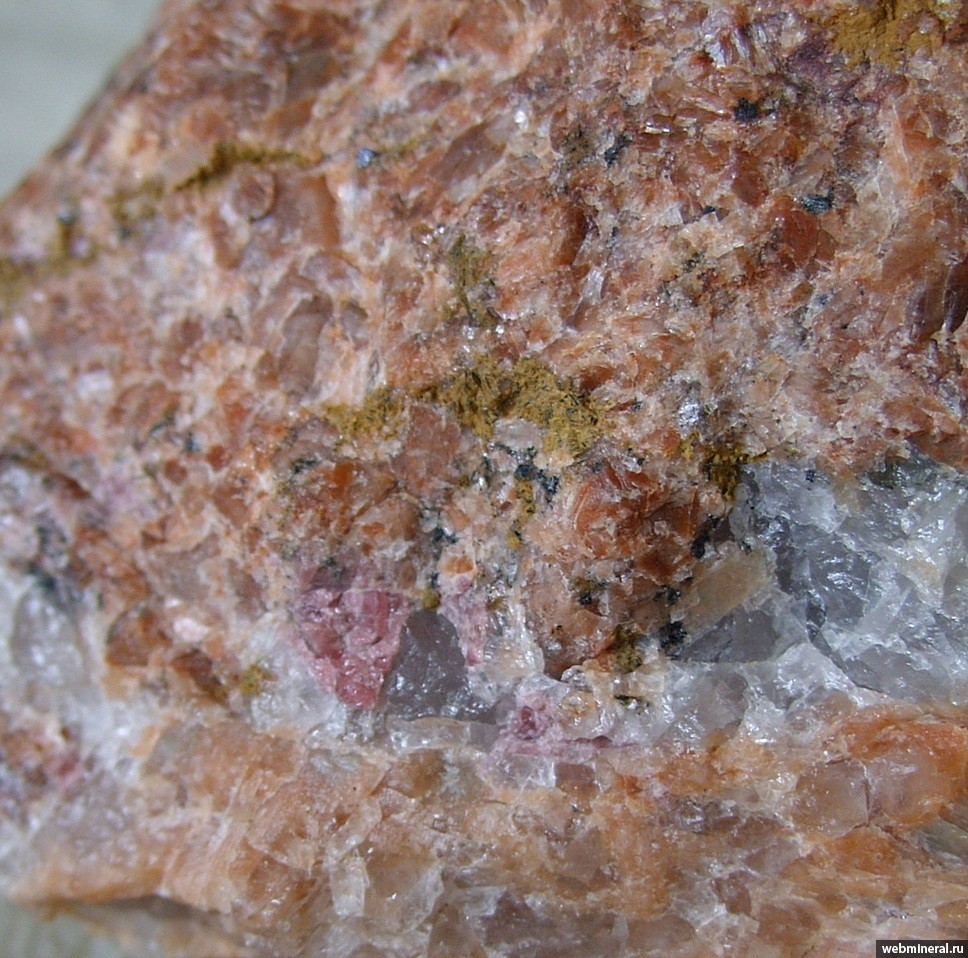 Треугольное сечение тетраэдрического кристалла розового гентгельвина и несколько его зёрен в микроклин-кварцевом прожилке секущем щелочной гранит. Изменённый горчично-коричневый эгирин и металлически-серые пластинки молибденита видны в центре снимка. Сборы конца 1980-х годов.