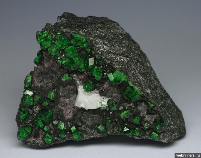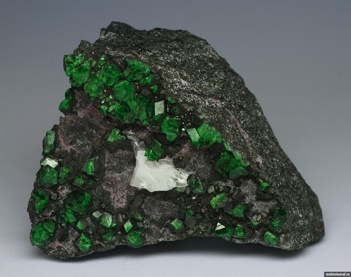 Кристаллы уваровита размером до 4 мм на хромите. Большая часть кристаллов уваровита частично или полностью замещены хлоритом.