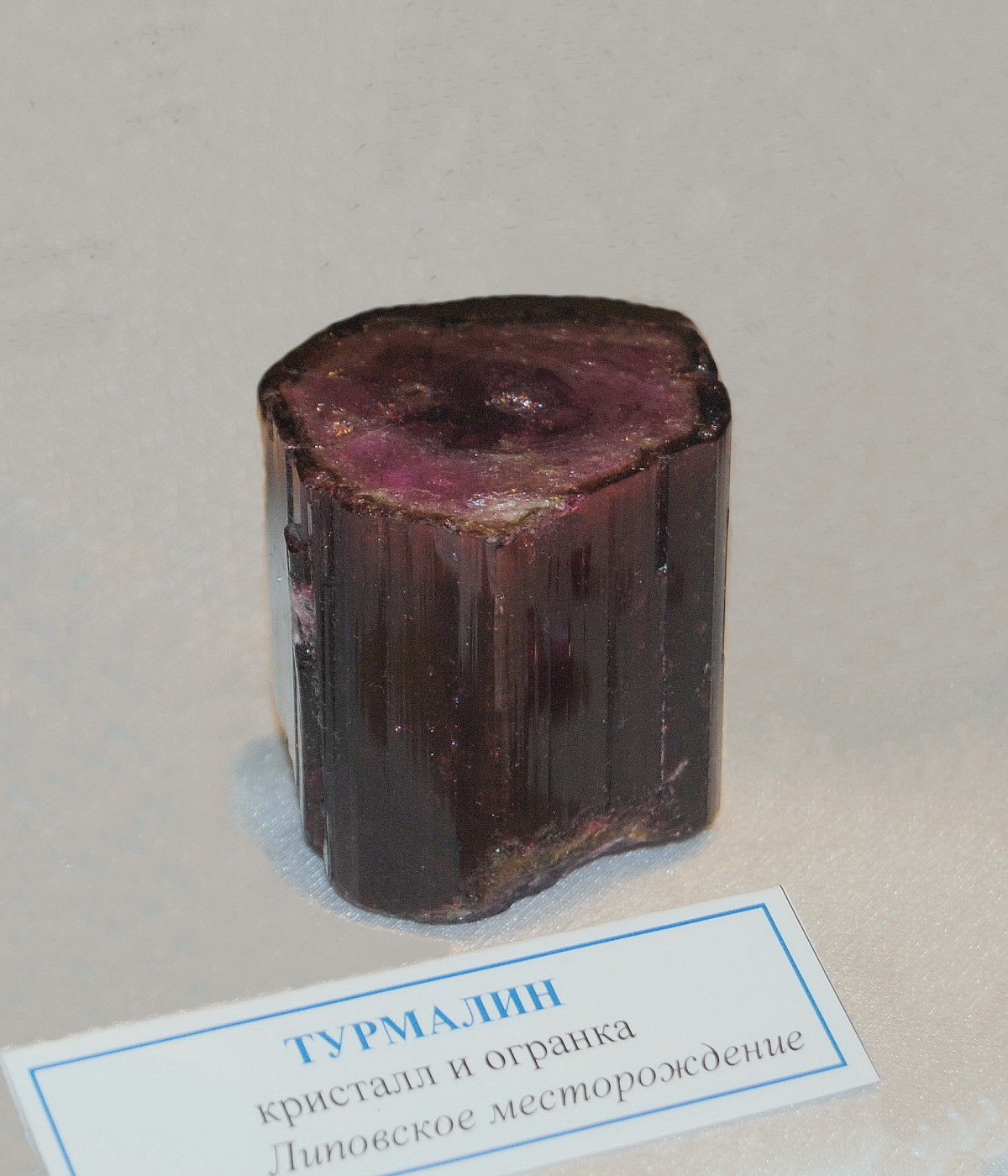 Кристалл эльбаита. Вероятно с Шерловой копи с жилы Старательская. Образец геологического музея Уральского государственного горного университета. Фото - апрель 2015.