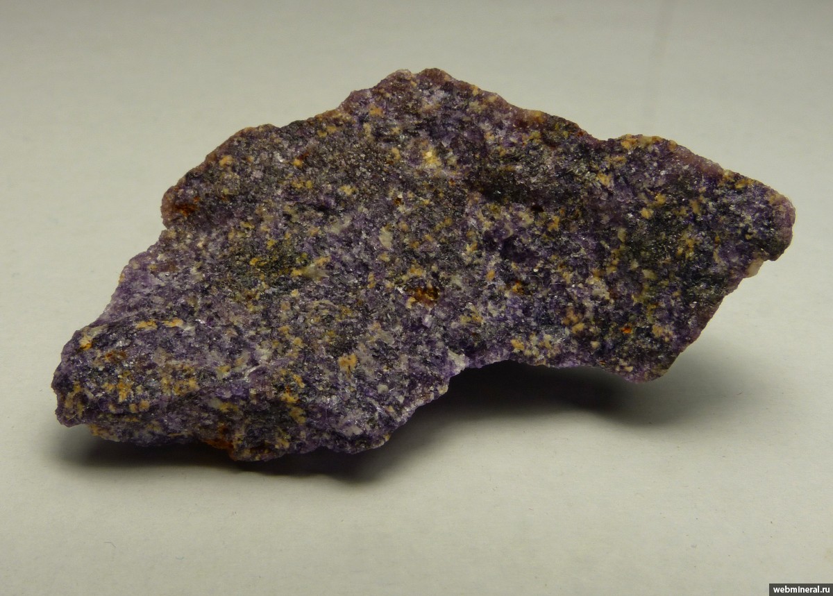Массивный агрегат фиолетового флюорита в который погружены зерна желтоватого бертрандита. Размер зерен бертрандита до 1 мм.