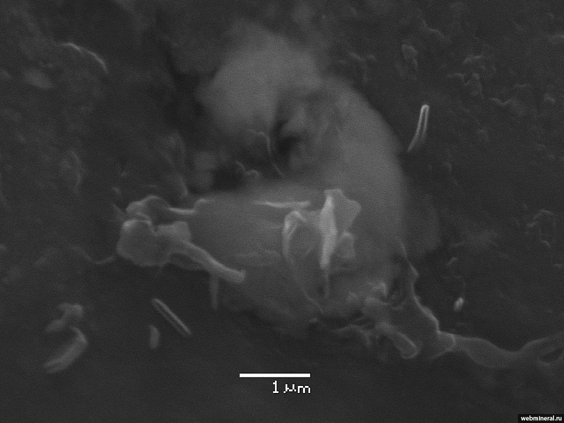 Округлая, яркая в обратно-рассеянных электронах (BSE) частица безжелезистого никельфосфида имплантированная в конденсатное стекло покрывающее поверхность индивидуального экземпляра иргизита. На втором фото во вторичных электронах (SE) видно что частица никельфосфида покрыта снаружи оболочкой более позднего конденсатного стекла. На оптическом фото показан общий вид иргизита покрытого матовой пленкой высокотемпературного конденсатного стекла (вся его левая часть) в которой были обнаружены включения никельфосфида в ассоциации с самородным никелем и тэнитом.