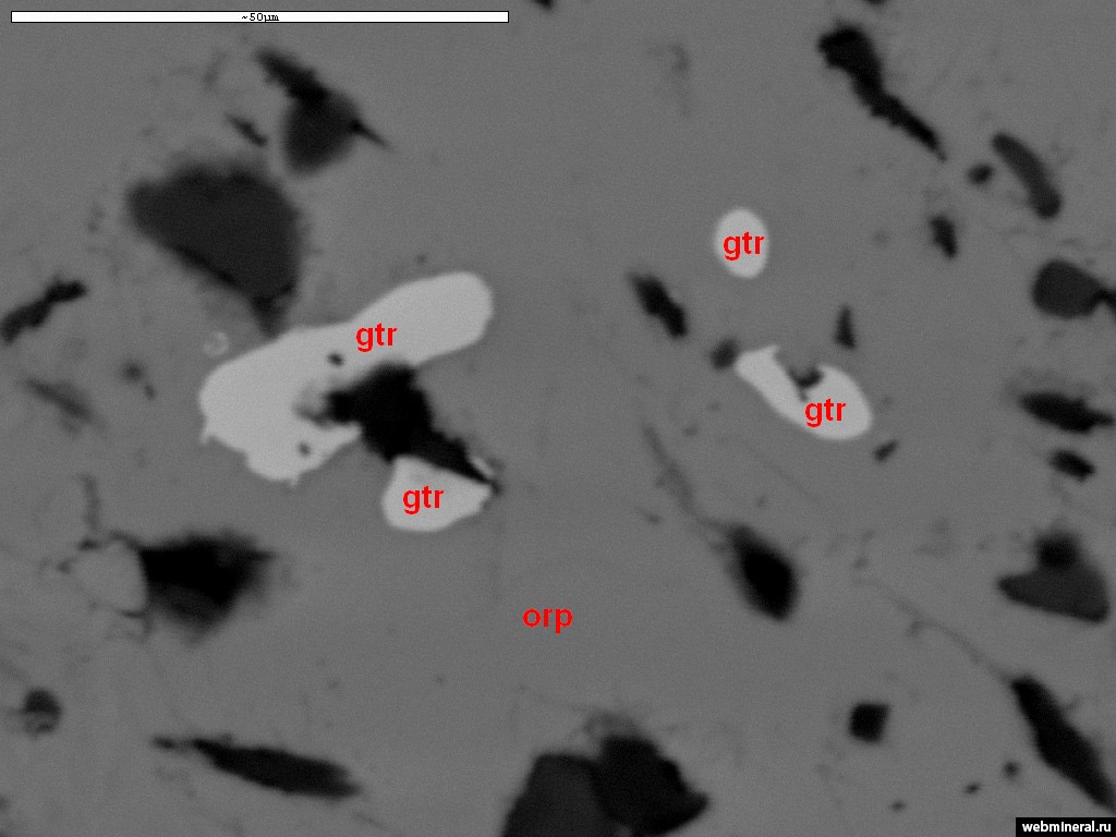 Округлые зерна геттардита (gtr) в аурипигменте (orp). Сборы М.Цыганко лето 2015г. РЭМ-фото. 1-я находка геттардита в РФ.