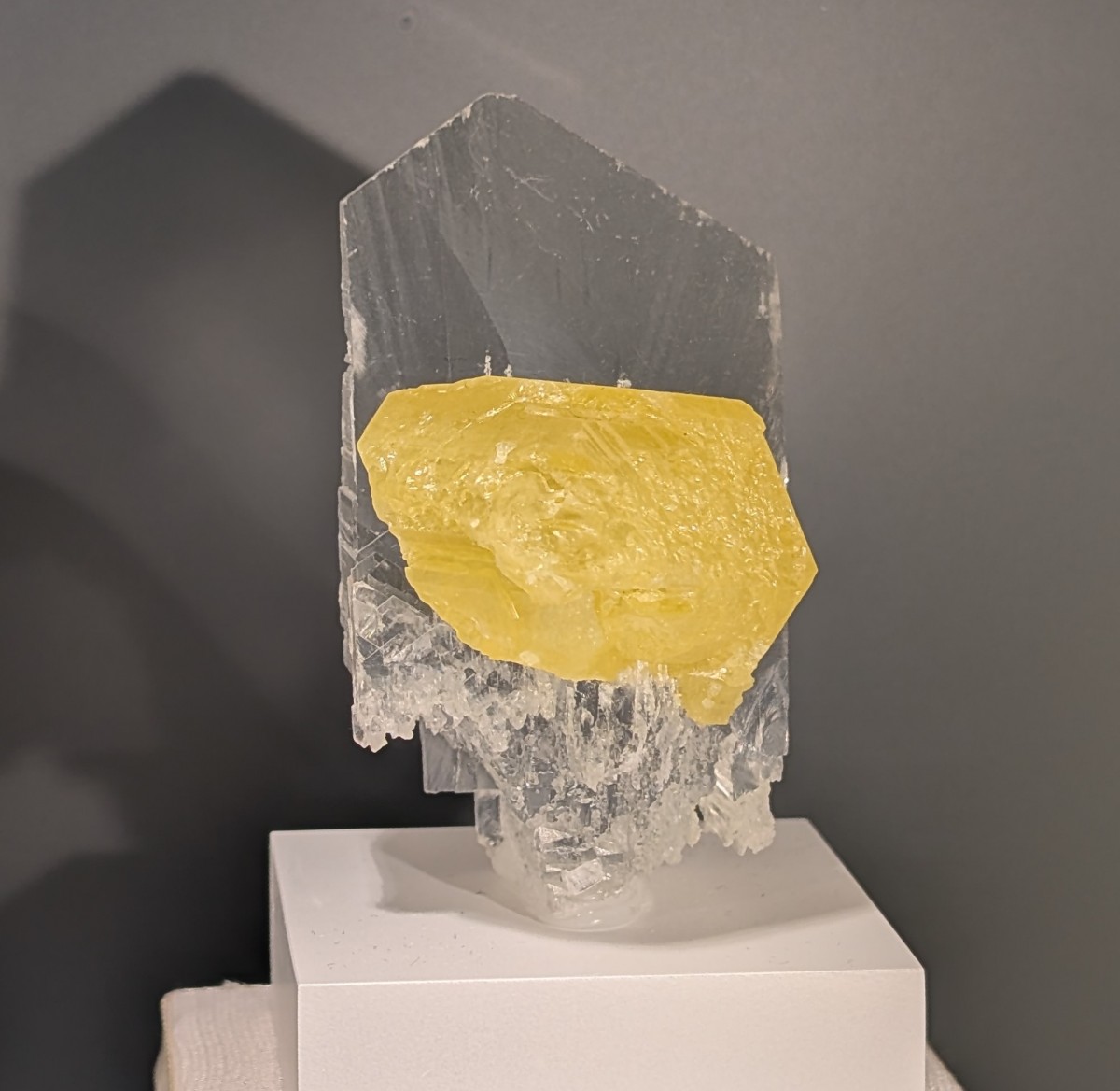 Кристалл самородной серы на прозрачном гипсе. Cozzo Disi Mine, Sicily, Italy.