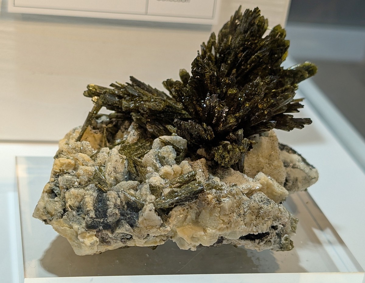 Сноповидный сросток кристаллов эпидота на светлом микроклине. Borow 14 Quarry, Strzegom, Poland.