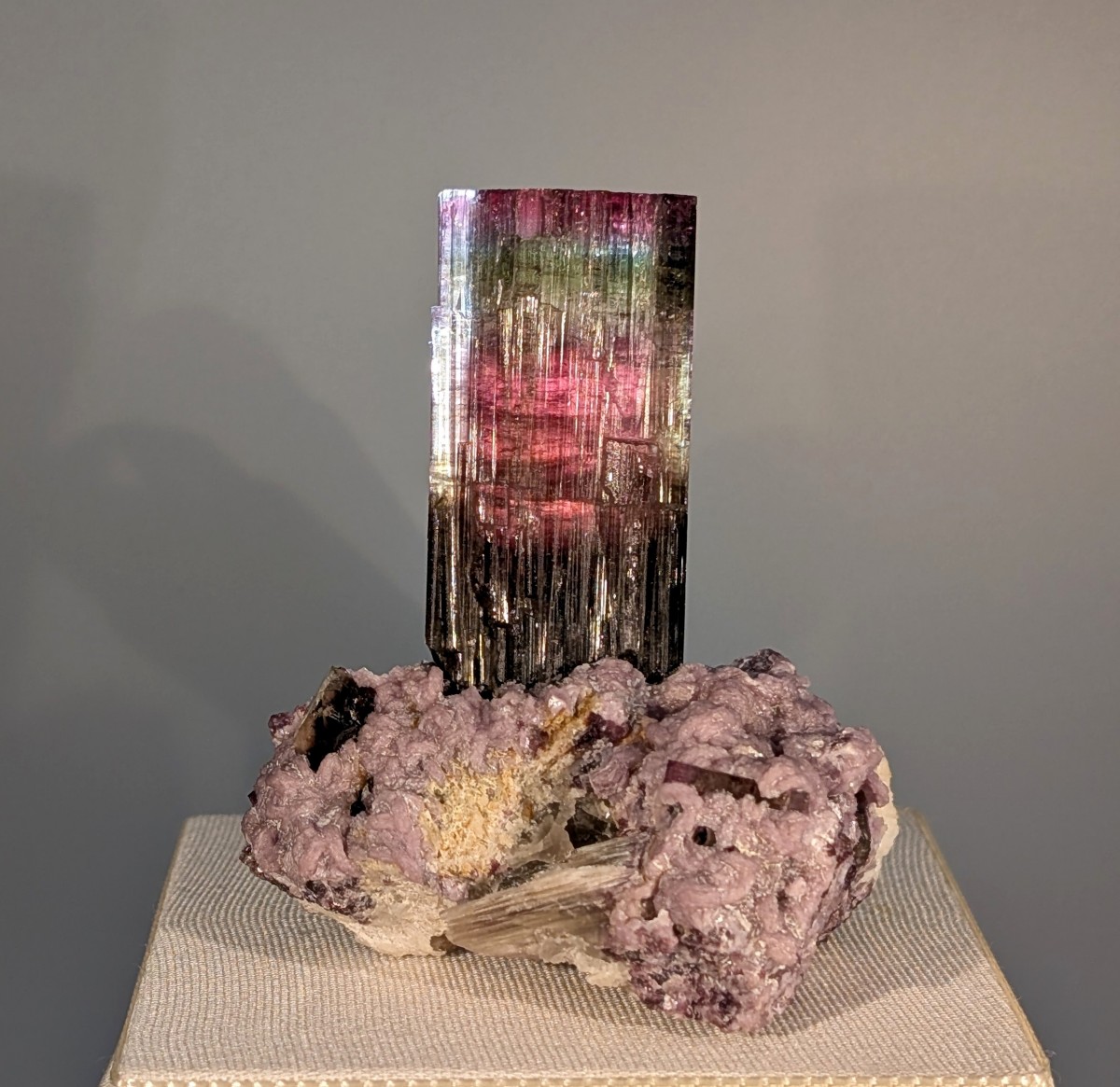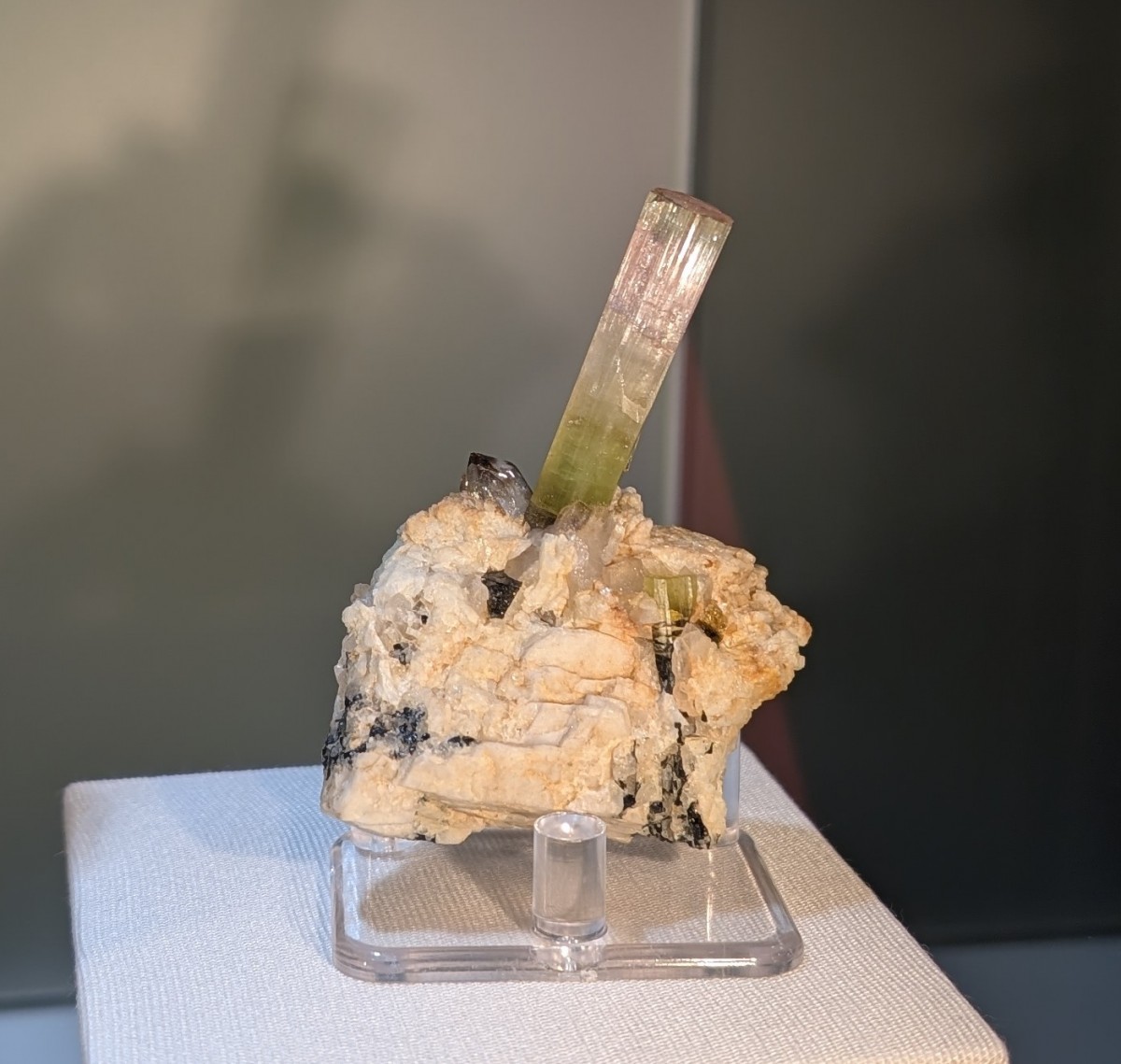 Образцы полихромного турмалина - крупный штуф и кристалл на породе. Grotta D'Oggy, San Piero in Campo, Elba, Italy/