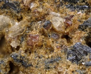 Красные кристаллы монацита размером около 0,2 мм и игольчатые кристаллы темного рутила, погружённые в массу чешуйчатого коричневато-желтого минерала из группы смектита. Перечисленные минералы выполняют небольшую полость в пегматите.