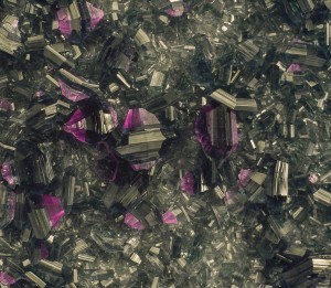 Хромититовая брекчия. Мелкие обломки хромитита, отороченные блестящими тонкими корочками уваровита, сцементированы крупнозернистым кальцитом. Уваровит очень яркий, светлый, желтовато-зелёный. На уваровите пятнами небольшие примазки бледно-сиреневых мелкозернистых масс и червеобразных агрегатов хлорита.