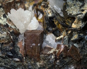 Призматические кристаллы бесцветного полупрозрачного бромеллита, зерна коричневого гельвина, фиолетового флюорита, белого кальцита, пластинки зеленовато-черного флогопита (?) в грейзенизированном скарне.