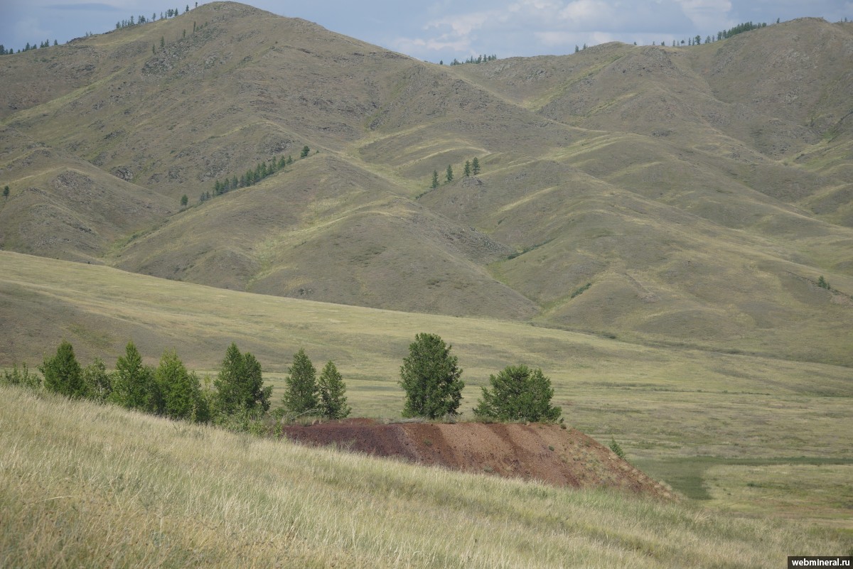 Комплексное (Fe-TR-Ba-флюоритовое) месторождение. Район месторождения сложен эффузивно-осадочными породами нижне-кембрийского и осадочными ордовикского возраста. Месторождение приурочено к крупной зоне разломов, образующих систему сопряженных ветвящихся разрывов с серией оперяющих разломов 2-го порядка, выраженных зонами брекчированных пород и вмещающих тела сидерит-флюорит-барит-гематитовых руд. Выявлено 8 рудных тел линзообразной формы размером от 30х170 до 100х850 м в плане и столбообразных в пространстве, прослеженных до глубины 1000 м. На месторождении отчетливо проявлена зона окисления до глубины 100-300 м, поэтому здесь выделяются два типа руд - окисленные и первичные. Первичные руды сложены сидеритом, баритом, флюоритом и гематитом; окисленные — гидроокислами Fe (гидрогематит, гетит-гидрогетит), баритом и флюоритом. Минералогические находки: барит!; геарксутит; карасугит--новый минерал; паризит!; тихоненковит-новый минерал; флюорит!; целестин!