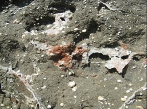 Пласты ороговикованных осадочных пород с гнёздами и жилами полуокисленного пирита. Артековский склон.