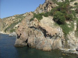 Жила зеленоватой (окрашенной селадонитом?) вулканической породы. Восточные обрывы мыса Фиолент.