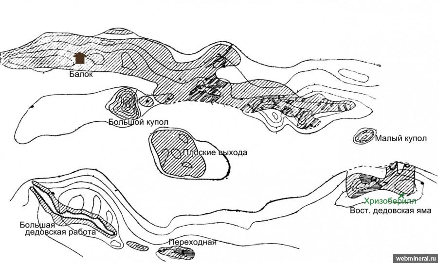 Описание: Схема расположения куста сближенных пегматитовых жил в восточной части Кузечной Вараки из книги Самоцветные тропы (Кожевников Ю.А., 2010).
