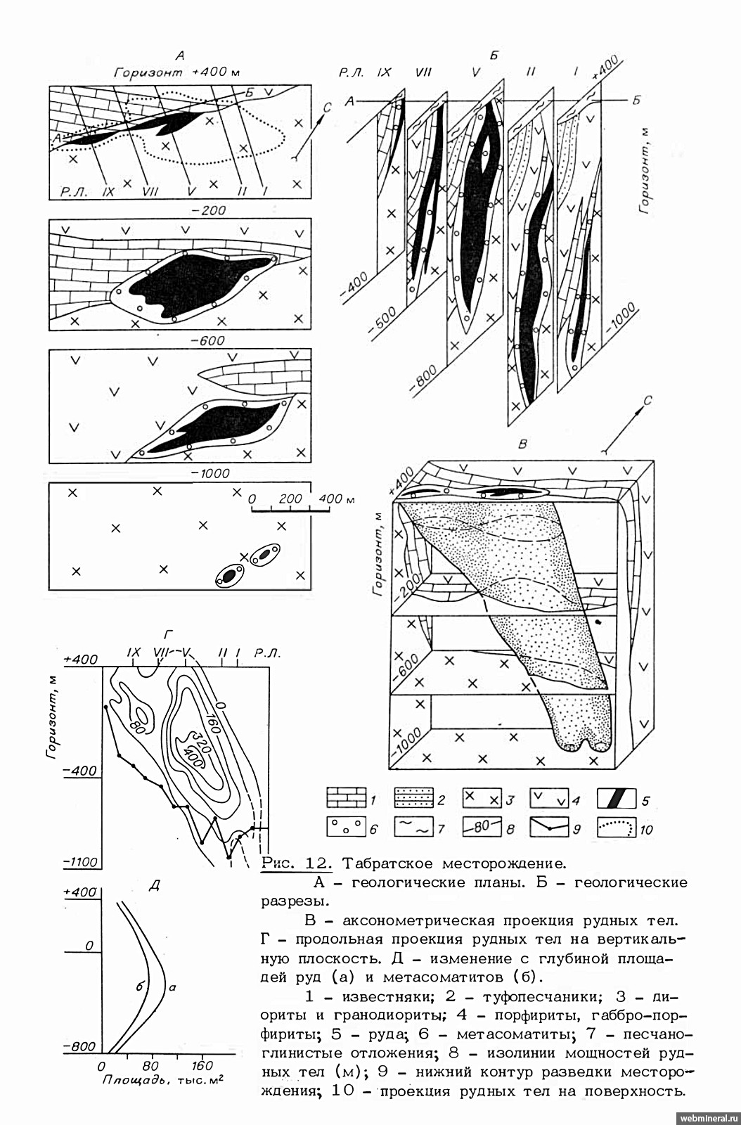 Описание: Геологические планы и разрезы. Аксонометрическая проекция главного рудного тела. Источник: Долгушин С.С., Павлов А.Л. Механизм формирования магнетитовых месторождений (на примере Алтае-Саянской складчатой области). Новосибирск: Наука, 1987.