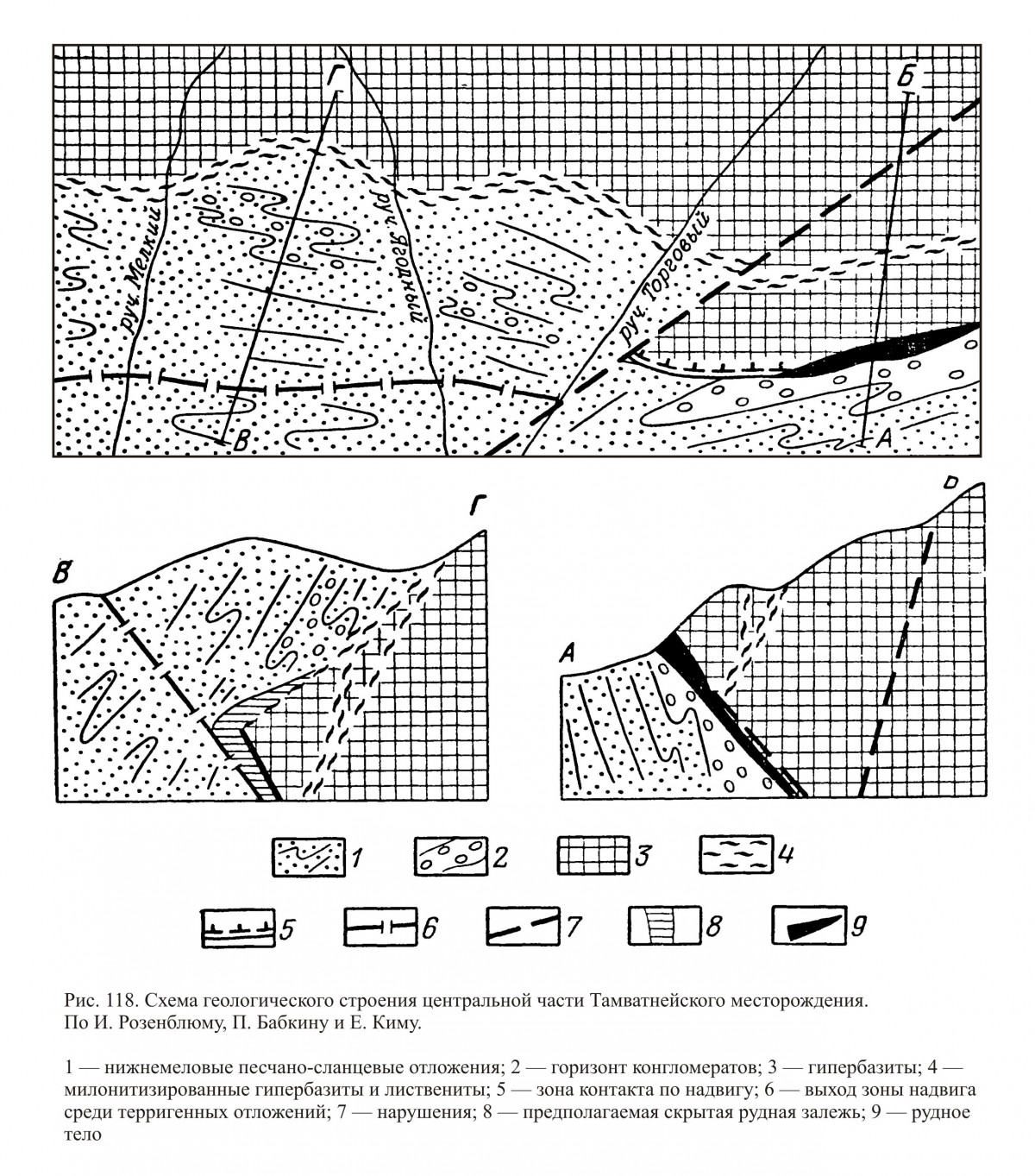 Схема геологического строения центральной части и разрезы Тамватнейского месторождения ртути (по И. Розенблюму, П. Бабкину, Е. Киму). Рисунок из книги Рудные месторождения СССР/ Гл. редактор В. И. Смирнов. Т. 2. М., «Недра», 1978. 399 с. (Рис. 118, стр. 298).