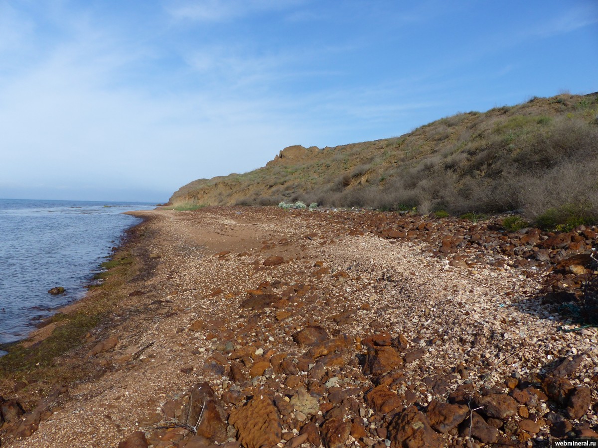 Коренной выход железорудного пласта прямо на пляже. В этом месте в составе железорудной толщи много глинистых прослоев и она легко подвержена размыву. Справа виден заросший травой глиняный язык оползня. Этот кусок пляжа знаменит тем, что иногда после штормов здесь обнажаются участки глины с округлыми конкрециями вивианита.