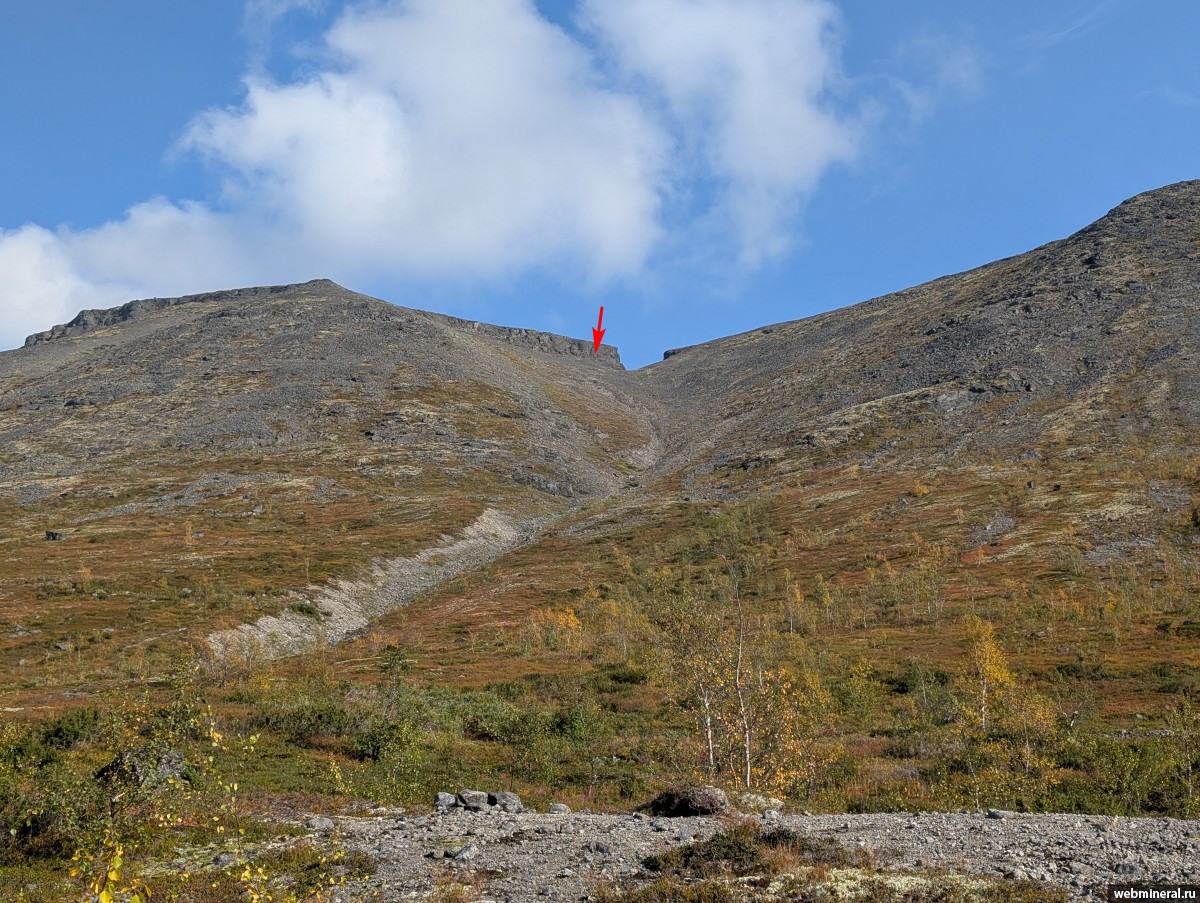 Описание: Вид на западный склон южного отрога плато Кукисвумчорр от гравийного карьера. Стрелкой обозначено примерное место расположения пегматита №50.