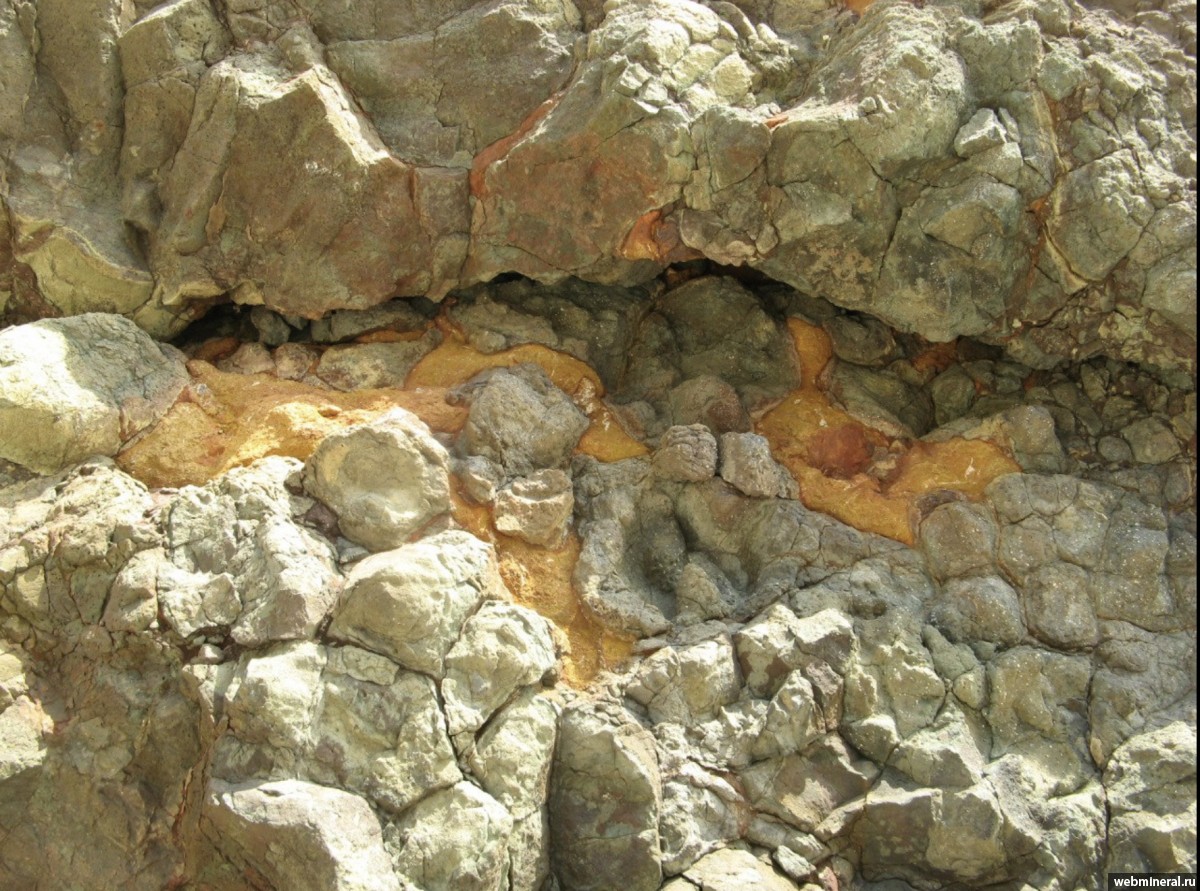 Описание: Шаровые лавы с пустотами заполненными желтой яшмой. Спилитовый мыс.