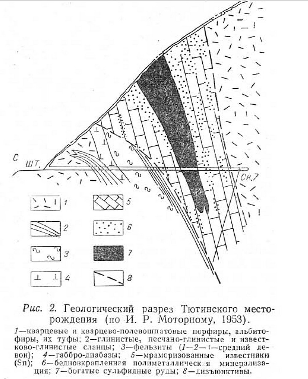 Источник: Тычинский А.А. Геологическое строение и закономерности размещения полиметаллических месторждений Горного Алтая // Труды института геологии и геофизики. Выпуск 13. Вопросы геологии и металлогении Горного Алтая. СО АН СССР, Новосибирск, 1963. С. 245-303
