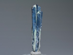 Зонально окрашенный кристалл голубого кианита в сливном кварце. Поперечная трещина в кристалле кианита (правая часть образца) залечена мелкочешуйчатым мусковитом. Образец из кварц-кианитовой жилы в ставролит-слюдистых сланцах. Находка - 2003 г.