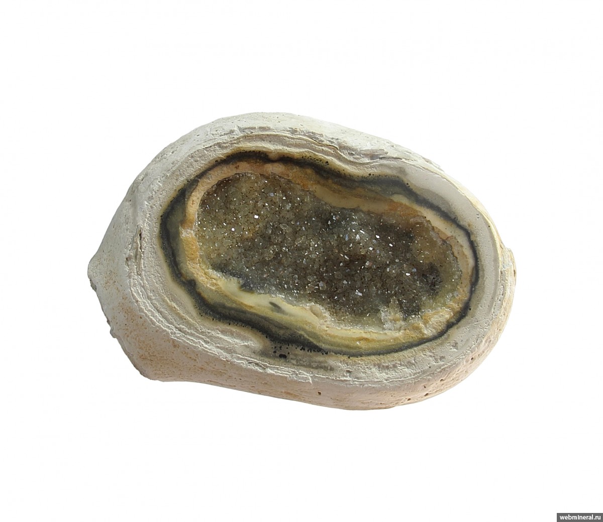 Прозрачный мелкокристаллический кварц инкрустирует стенки внутренней полости гжельской кремнёвой конкреции с характерным белым пористым внешним слоем.